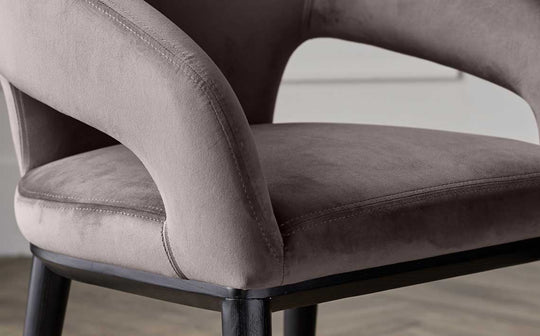 Thoughtfully designed for those long dinner parties that run late, the Heath mocha plush velvet and black wood dining chair brings comfort and sophistication to every gathering. With its generous proportions, high supportive back and gently scooped arms, this is where conversations linger and moments matter. The rich mocha velvet invites you to settle in whilst dark wood legs ground the design with understated elegance.