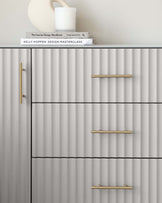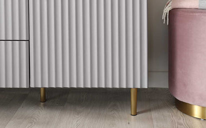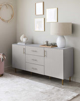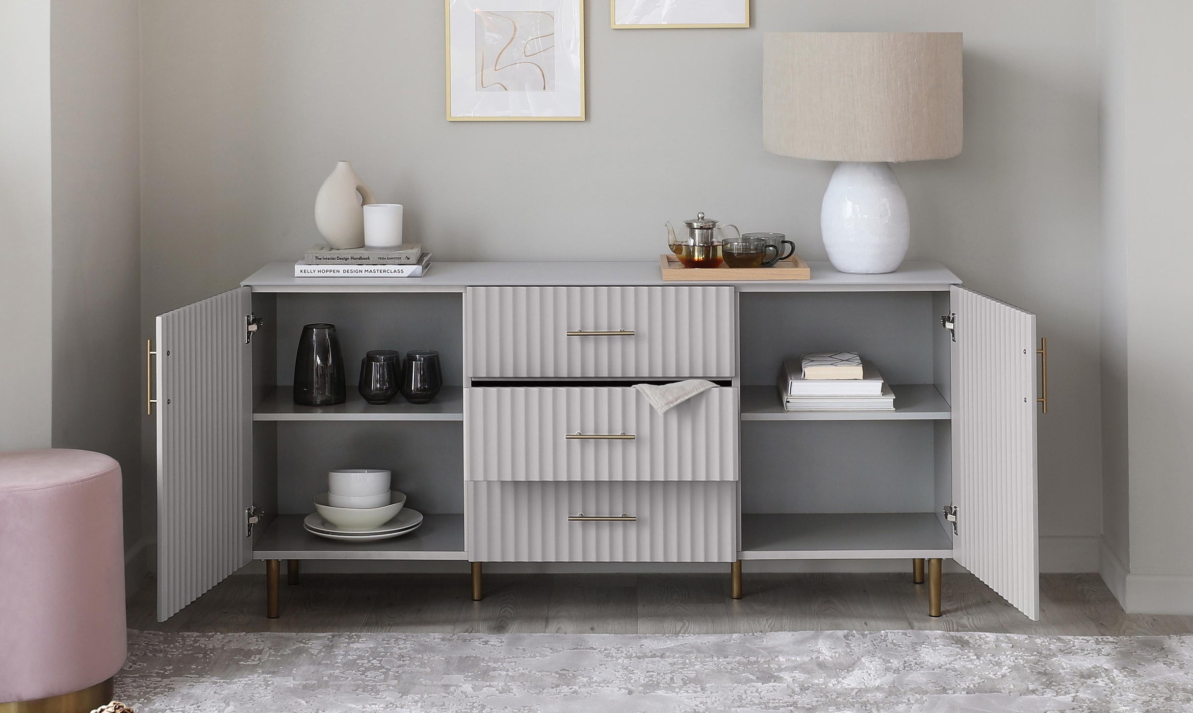 The Albury light grey sideboard brings sophisticated storage to any room with its considered blend of frosted glass doors, velvet-lined drawers and brass accents. This versatile piece offers generous space across two cupboards and three drawers, keeping everything from dinnerware to documents beautifully organised while maintaining a refined presence in your living or dining space.
