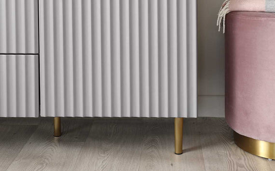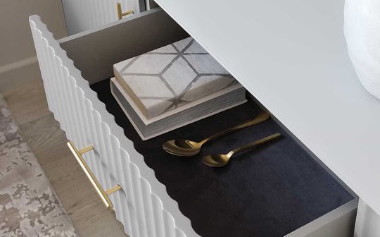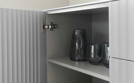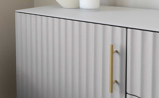 The Albury light grey sideboard brings sophisticated storage to any room with its considered blend of frosted glass doors, velvet-lined drawers and brass accents. This versatile piece offers generous space across two cupboards and three drawers, keeping everything from dinnerware to documents beautifully organised while maintaining a refined presence in your living or dining space.