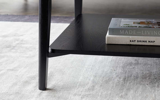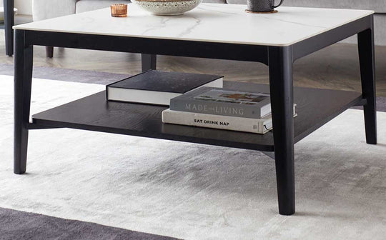 The Banks coffee table brings sophisticated contrast to your living space with its striking white marbled ceramic top and rich black wood base. The square design creates clean lines while the open shelf below keeps essentials within reach. Built to handle real life, the heat-resistant ceramic surface means hot mugs and plates can go straight down without worry.