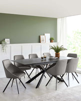 The Cleo dark grey faux leather swivel chair brings professional style to your dining space or home office without sacrificing comfort. Upholstered in soft Durosoft faux leather with a sleek curved silhouette, this chair features a 180-degree swivel mechanism and self-return function for effortless movement. The cushioned seat and supportive back ensure comfort through long working days.