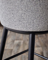 The Evelyn grey fabric bar stool brings understated luxury to kitchen islands and breakfast bars. Exclusively designed with exaggerated curves and a high wraparound backrest, this sophisticated piece offers exceptional comfort for casual dining. The soft grey salt and pepper chenille upholstery pairs beautifully with sleek black wooden legs, creating a timeless look that works in both modern and traditional spaces.