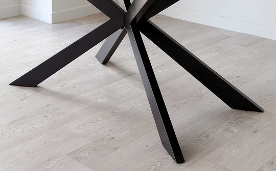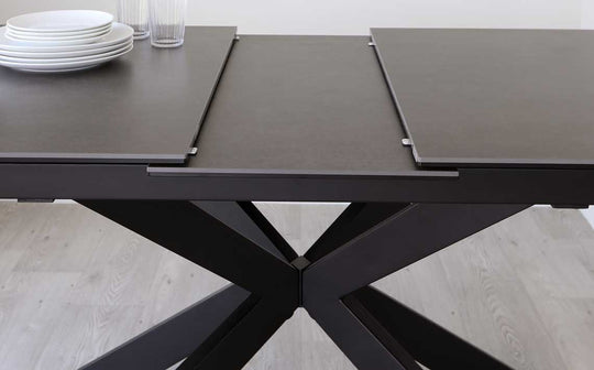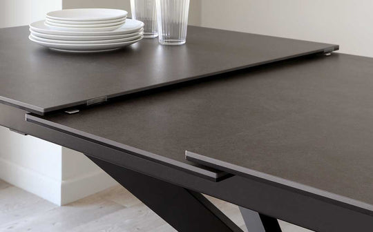 Transform your dining space with the Hayden dark grey ceramic extending dining table - a statement piece that effortlessly accommodates 8 to 10 guests. This exclusive Danetti design combines a sleek ceramic top with a dramatic starburst pedestal base, creating the perfect setting for intimate family meals and larger gatherings alike. Built to handle real life with heat and scratch-resistant surfaces.