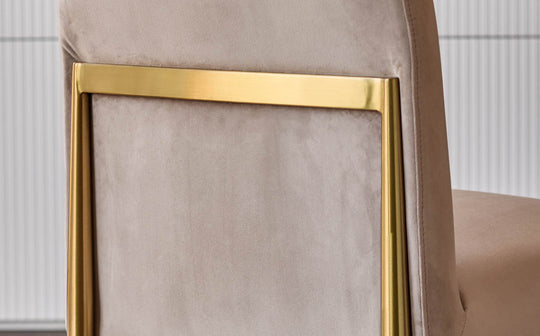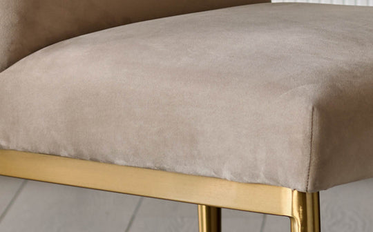 The Keira champagne velvet dining chair brings sophisticated comfort to your dining space. Upholstered in plush champagne velvet with eye-catching linear stitching, this chair combines luxurious texture with contemporary style. The brushed brass metal frame adds a glamorous touch while built-in floor protectors keep your floors pristine. Perfect for dinner parties that run late or quiet morning coffees.