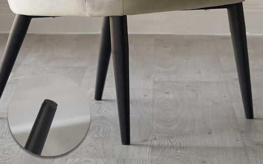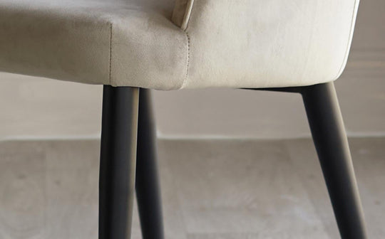 The Lani champagne velvet dining chair brings sophisticated comfort to every meal. Sold in pairs, these beautifully curved chairs feature plush velvet upholstery and supportive armrests that invite long dinners and lingering conversations. The sleek black metal legs create a striking contrast, making them versatile enough to complement both contemporary and traditional dining tables.