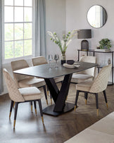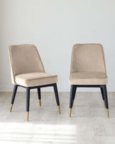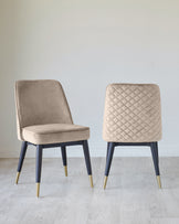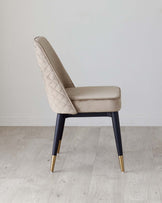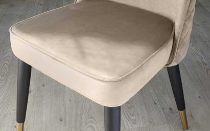The Mae champagne velvet dining chair brings instant glamour to your dining space. With its eye-catching quilted backrest and sumptuous velvet upholstery, these chairs make every meal feel like an occasion. Black ash wood legs capped with brushed brass details add contemporary sophistication, while the cushioned seat ensures comfort through long dinner parties. Sold in pairs for coordinated style.
