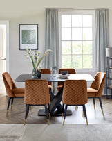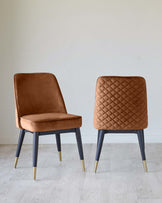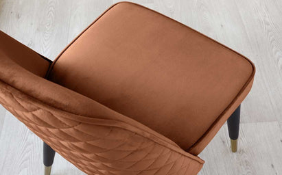 The Mae rust velvet dining chair brings a rich warmth to your dining space with its eye-catching quilted backrest and sumptuous velvet upholstery. The diamond-patterned quilting creates sophisticated texture, while black ash wood legs capped with brushed brass details add contemporary flair. Perfect for long dinner parties or quick weekday meals, the cushioned seat ensures everyone stays comfortable.