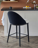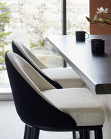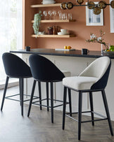 The Scarlett black mixed material bar stool brings contemporary style to your kitchen island or breakfast bar. Its two-toned upholstery combines smooth woven fabric with a luxuriously soft cushioned seat and curved backrest for lasting comfort. Sleek black ash wood legs provide durability and sophistication, making this the perfect perch for morning coffee or evening conversations.