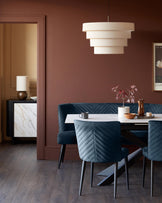 The Serena dark blue velvet 3 seater dining bench brings sophisticated comfort to your dining space. Upholstered in sumptuous dark blue velvet with elegant chevron quilting on the backrest, this bench seats 3 comfortably. Perfect for creating a more intimate, relaxed dining atmosphere or maximising seating when entertaining.
