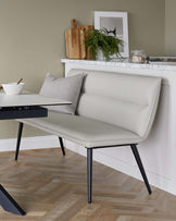 The Seth 3-seater dining bench effortlessly combines style and comfort, adding a touch of charm to any dining space. Upholstered in a luxurious light grey faux leather, it offers a soft, textured surface with an exquisite grain, ensuring lasting durability. The sleek, linear design features a backrest with subtle vertical channels that create a pleated effect, adding a touch of sophistication. Supported by a sturdy powder-coated steel frame and complete with built-in floor protectors, this bench provides both style and practicality. Create a cohesive look by pairing the Seth bench with a matching dining table and chairs, or opt for a contrasting table for a more eclectic feel. Introduce scatter cushions for added comfort and pops of colour or texture.Details