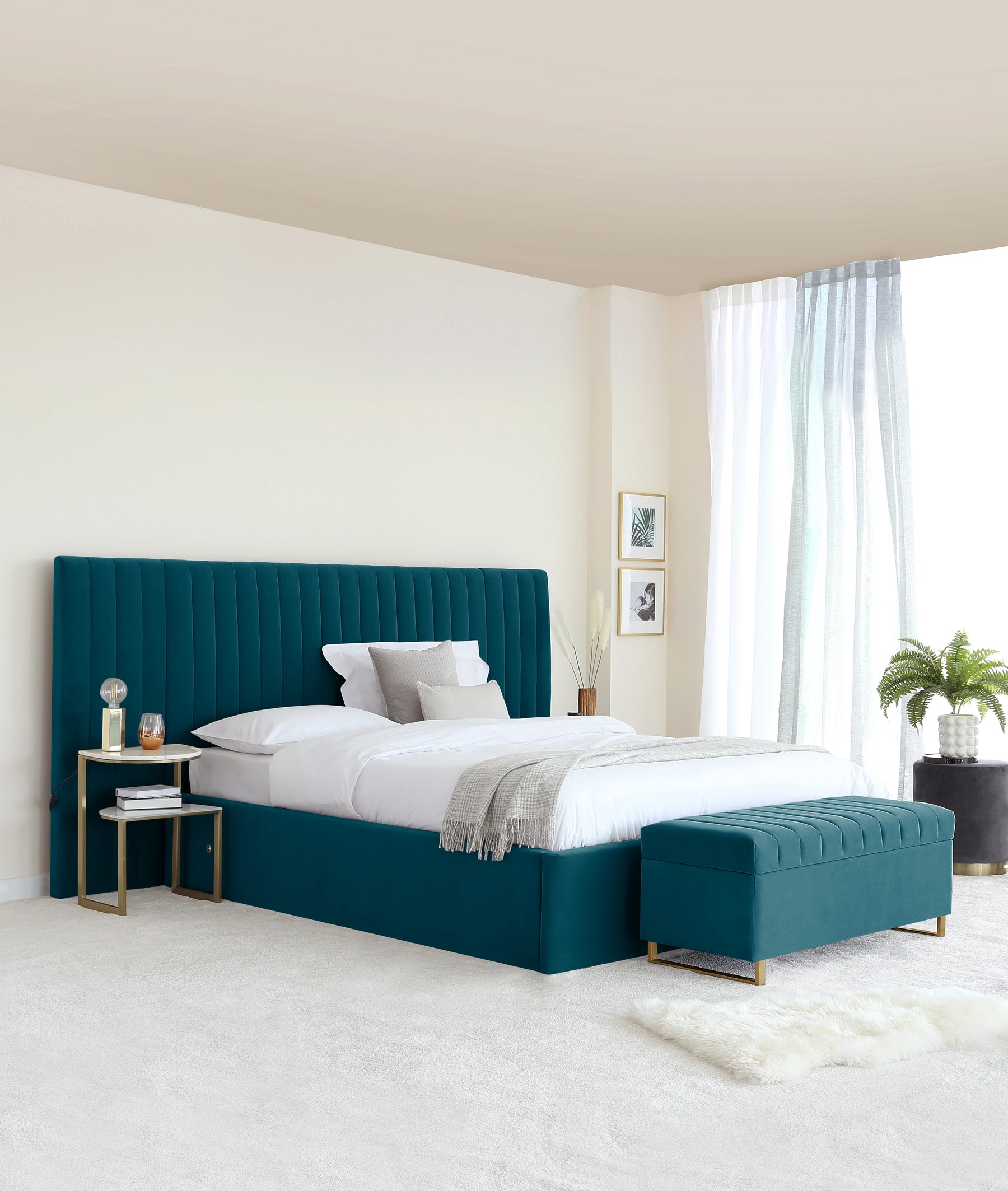 If your bedroom needs an elegant and luxe update, you’ll love this look. Our Amalfi Luxe set up - complete with matching ottoman and an Art Deco inspired bedside table.