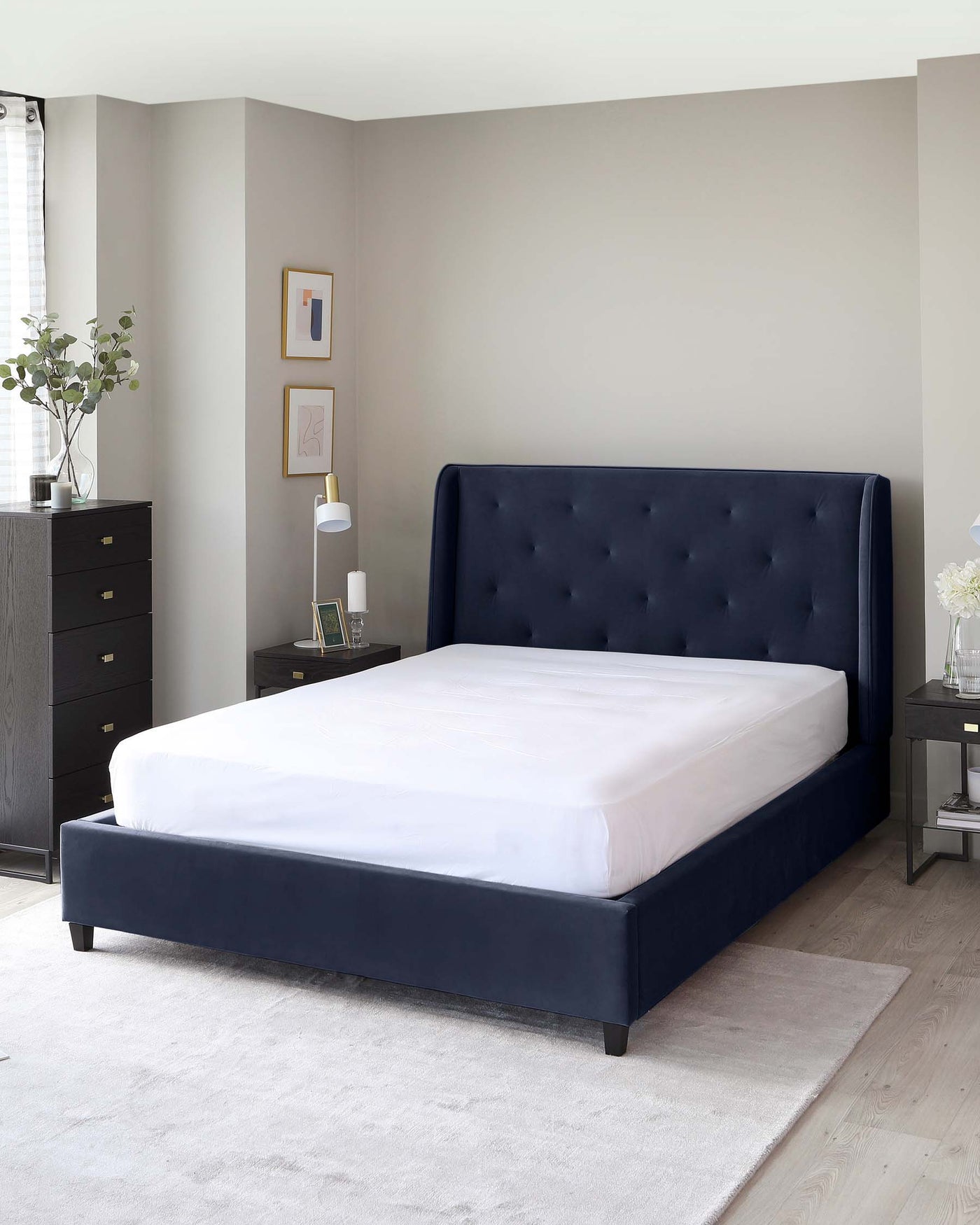 - What style of bedside tables complement a blue king size bed?A blue king-size bed offers a versatile base for various bedside table styles. For a cohesive look, consider matching the bedside table material to the bed's frame, whether it's wood or metal. If your bed is upholstered, complement the blue with bedside tables in a contrasting material like a marbled ceramic or mirrored finish for a touch of glamour. Alternatively, painted wood finishes in lighter shades create a relaxed ambiance, while darker tones add a sense of drama. Shape and size are also key. For a modern feel, opt for sleek, minimalist designs, whereas classic or ornate shapes complement a more traditional blue bed. Don't forget the practicalities--ensure the bedside table height suits your bed and offers ample storage.