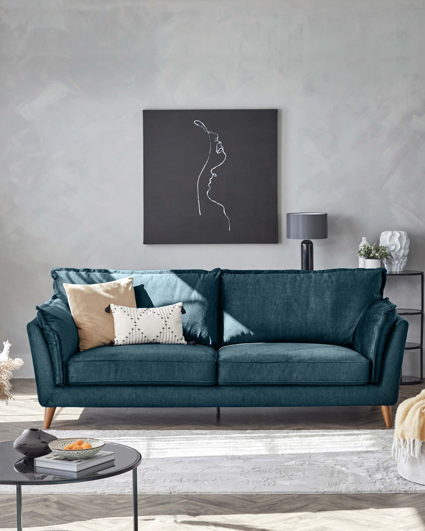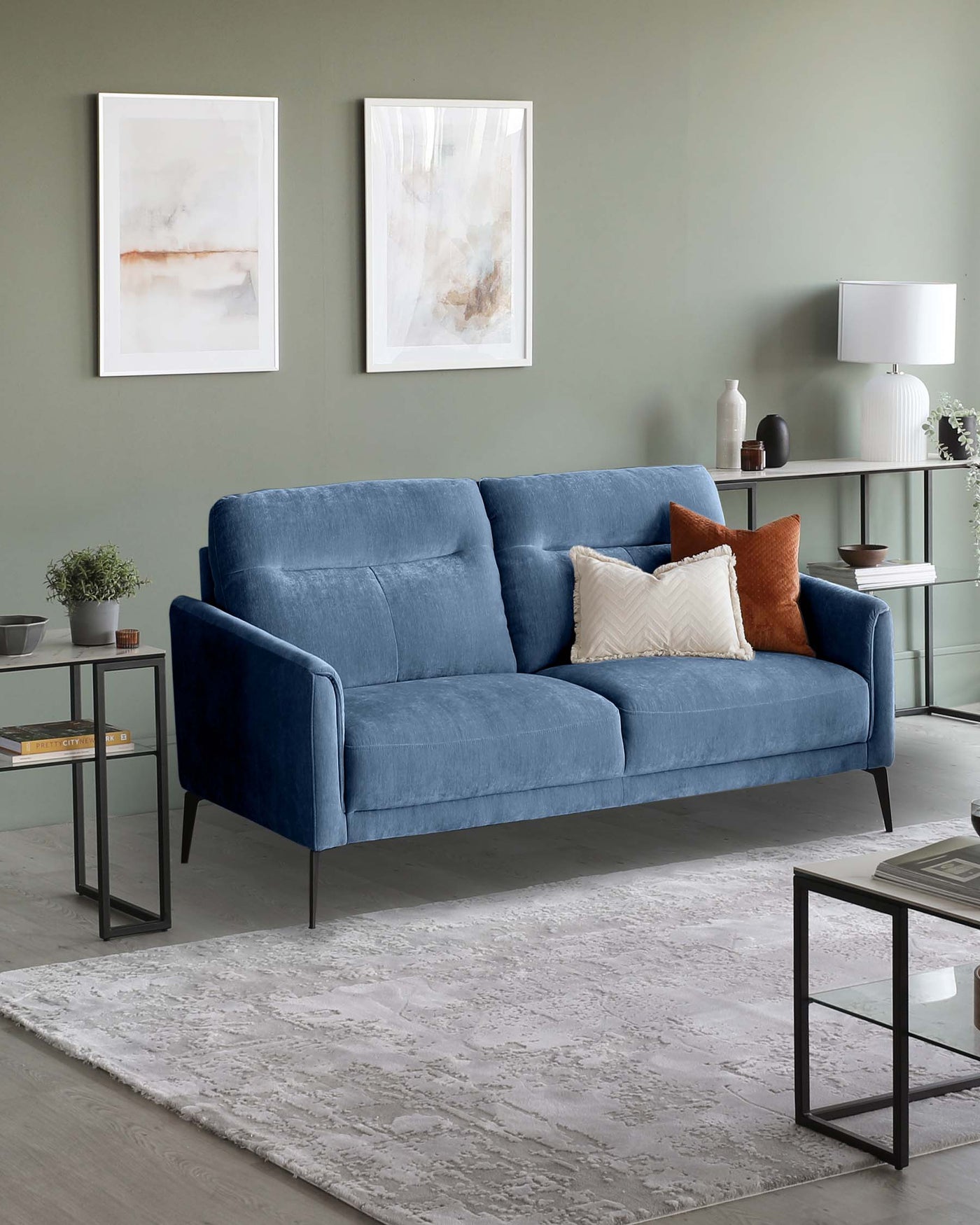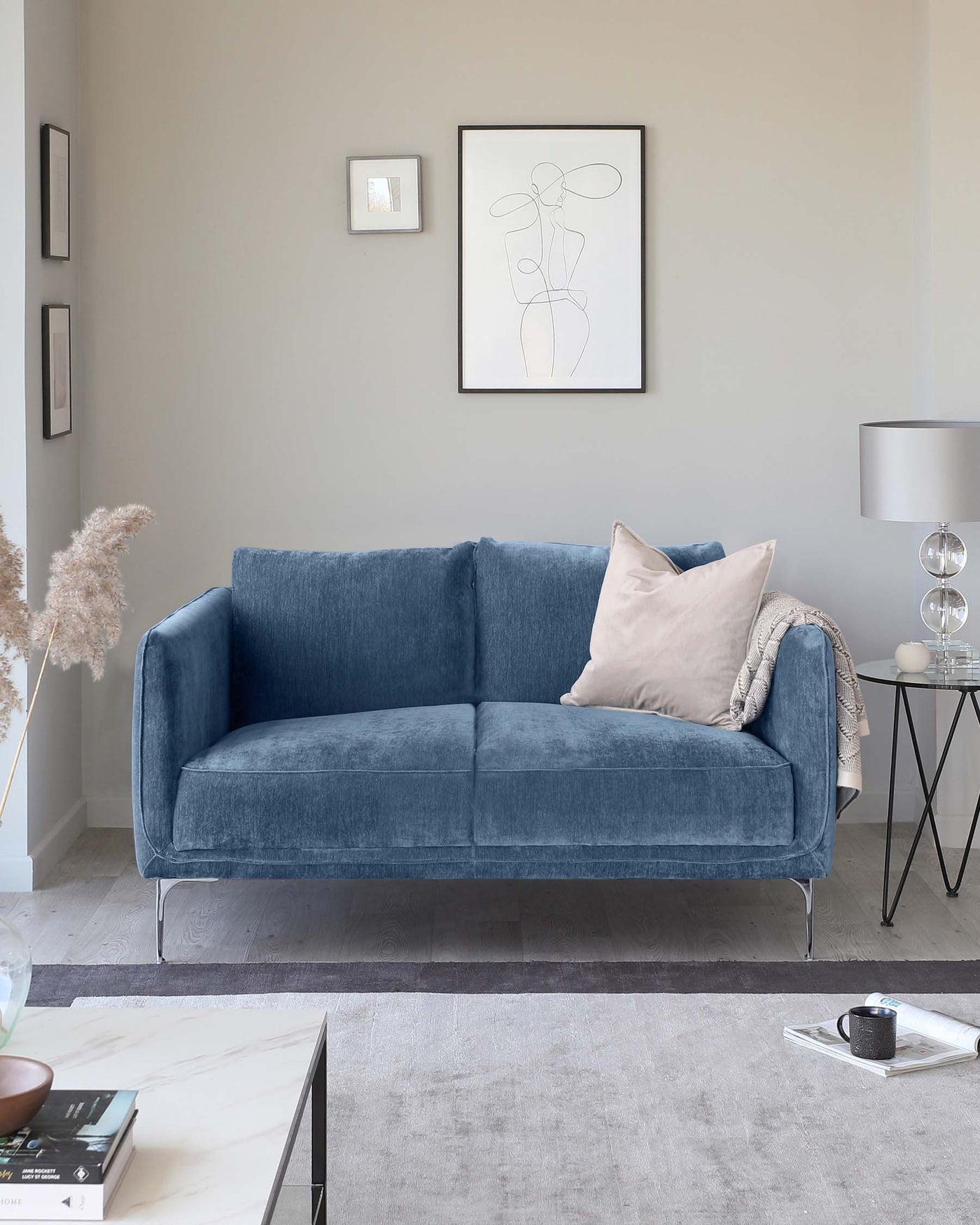 - How can I style a blue sofa in my living room?A blue sofa offers versatile styling options. For a sophisticated look, pair a navy blue velvet sofa with warm metallic accents like gold or brass in your lighting and accessories. Lighter blues create a calming atmosphere and work well with natural materials like wood and rattan. Scatter cushions in contrasting textures and patterns, such as geometric prints or faux fur, can add depth and visual interest. A neutral rug can tie the look together and define the seating area. Consider the shade of blue and choose complementary colours for your walls and other furniture to create a cohesive and stylish living room. For more information visit our blog post.