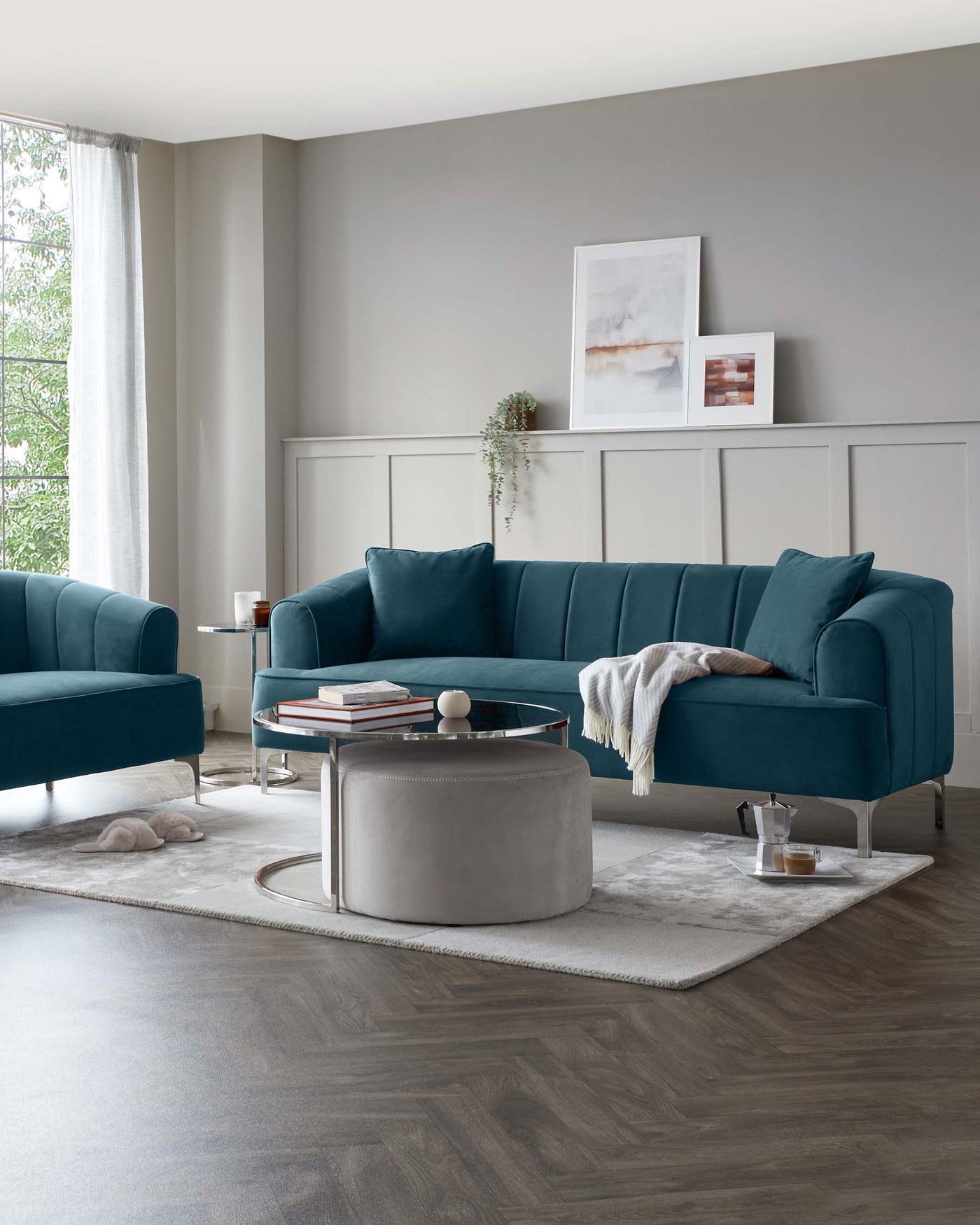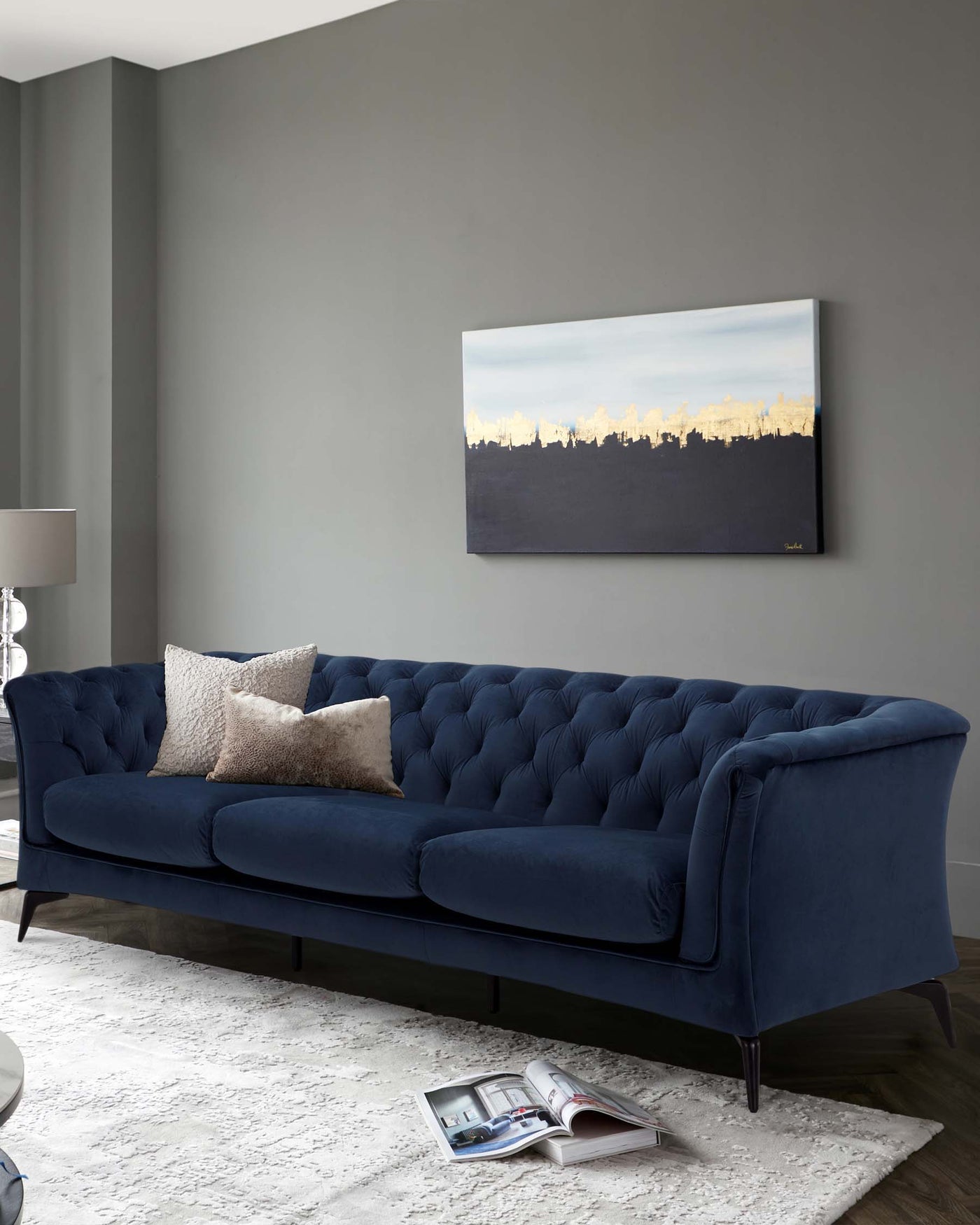 The sofas are available in a variety of finishes including sumptuous velvet and soft chenille, providing a tactile element to your seating. The colour palette features a beautiful spectrum of blues, from light navy to rich dark blue, enhancing the aesthetic appeal.