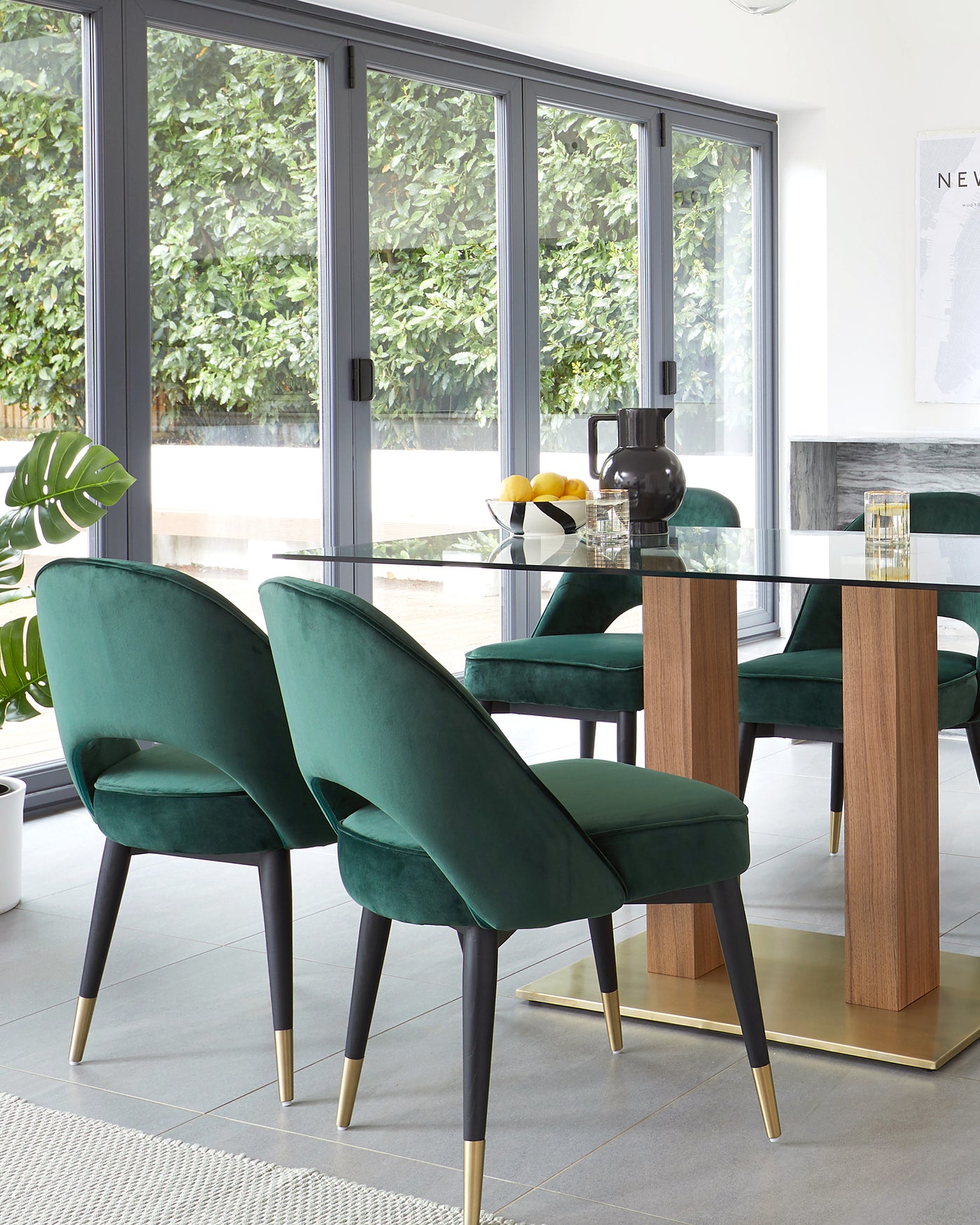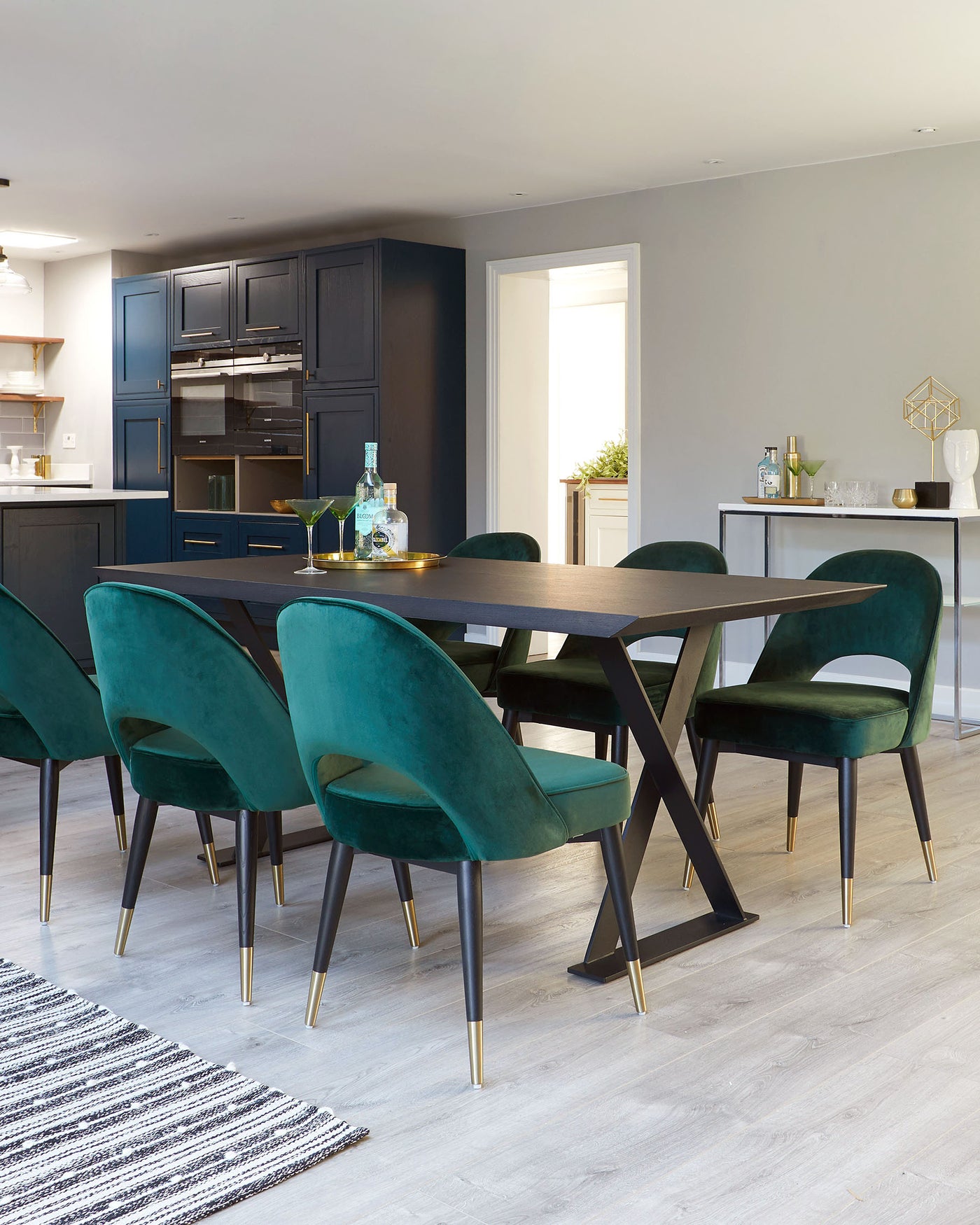 The design inspiration for this range varies from modern to mid-century and even art deco, offering a unique dining experience. Each set is designed to accommodate varying numbers of diners, with features such as extension leaves for added flexibility. Whether you prefer the industrial chic of dark wood or the opulence of brass and marble, our green dining sets range provides a wealth of options to elevate your dining space.