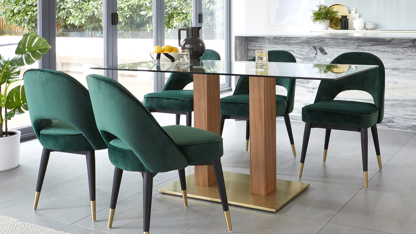 - How can I style my green dining set to complement my dining room?A green dining set offers a versatile base for various dining room styles. For a natural, botanical feel, pair it with neutral walls, wooden flooring, and woven textures like a jute rug. Introduce pops of gold or brass through lighting or accessories for a touch of elegance. If your green is vibrant, complement it with patterned cushions or artwork featuring complementary colours. For a calming space, choose muted tones like sage green and pair them with soft greys and blues. Add warmth with a patterned rug or wooden accessories. To create contrast and drama, pair a darker green set with black accents and bold lighting, or use lighter, brighter shades on the walls. If you have a smaller dining space, opt for lighter greens and sheer curtains to create a sense of airiness.