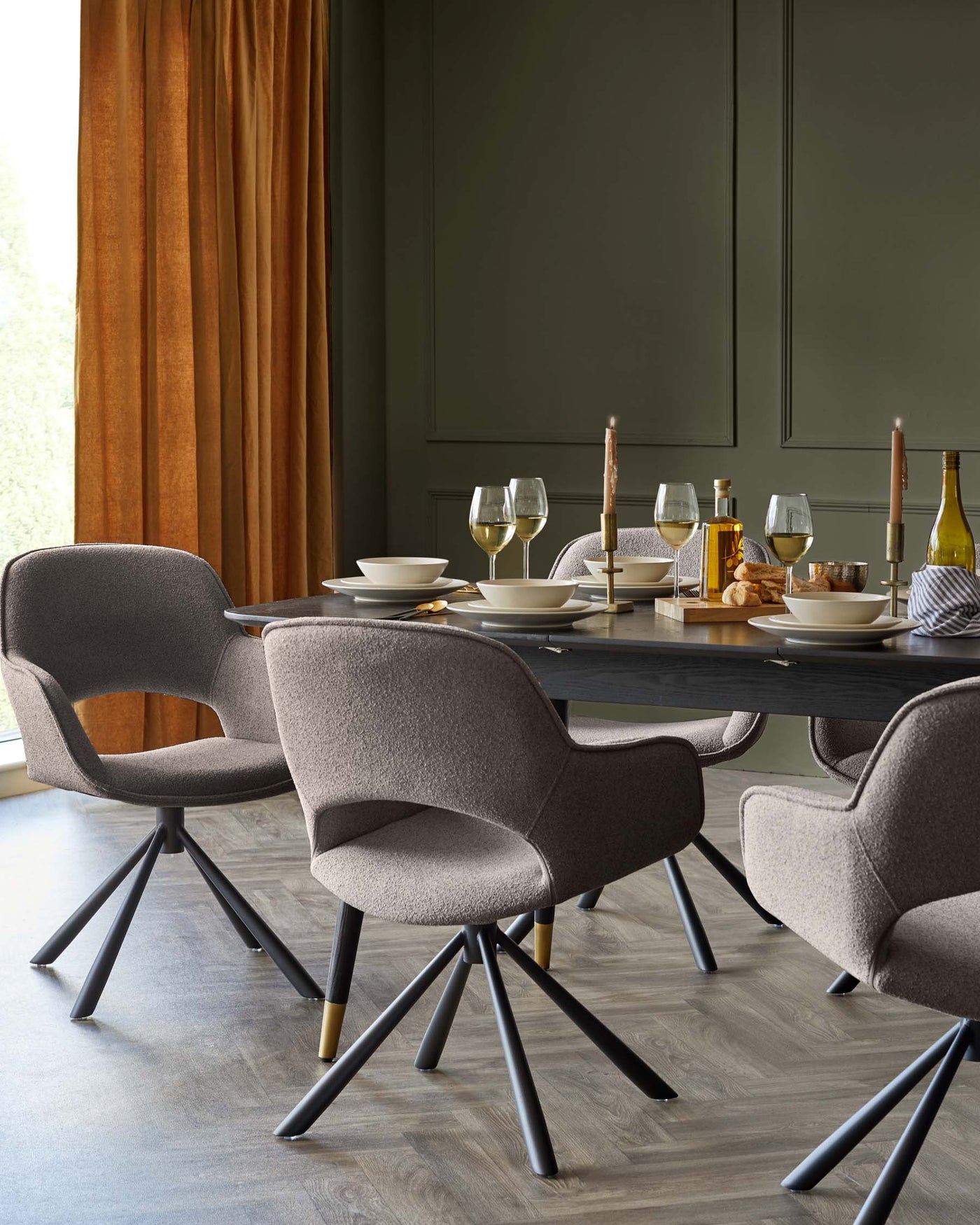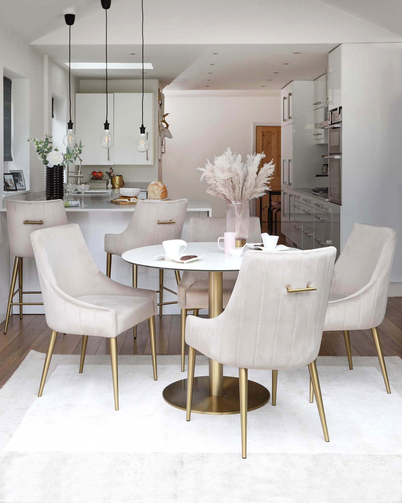 You'll find dining sets with distinctive details like starburst leg designs, ceramic surfaces, and plush velvet chairs for an added touch of luxury. We also offer options with innovative features such as concealed extending mechanisms for ease of use and swivel functions for convenience.