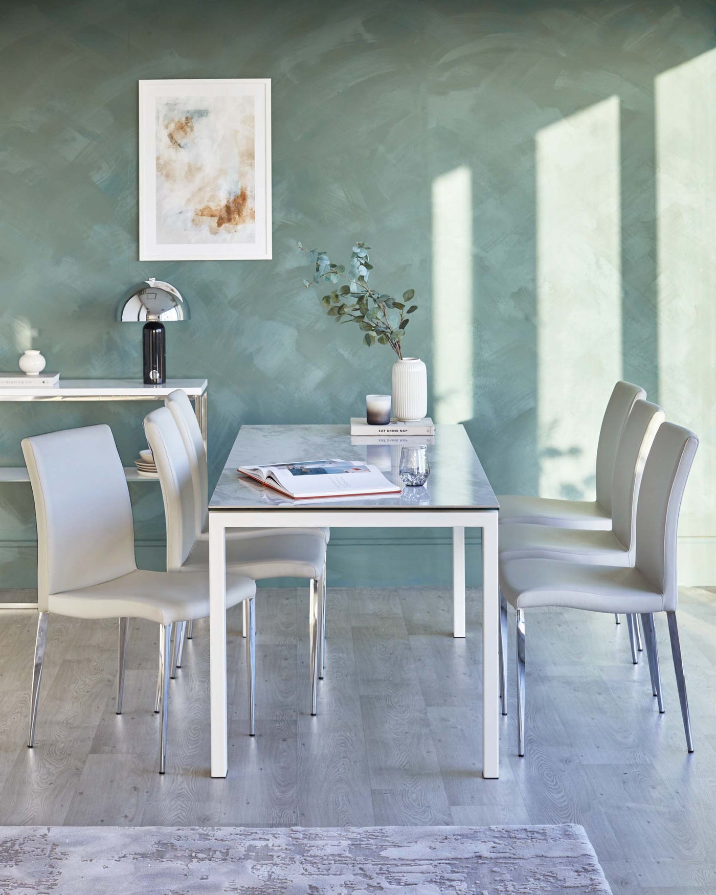 - How do I care for my large dining table and chairs to keep them looking their best?Regular care will keep your dining table and chairs looking their best. Dust frequently with a soft, dry cloth, working with the grain on wood finishes. Wipe up spills immediately to prevent staining, especially on porous materials like wood. For most finishes, a slightly damp cloth with a mild detergent is sufficient for cleaning. Avoid harsh chemicals or abrasive cleaners which can damage the surface. Protect your table from heat and scratches by using placemats and coasters, particularly important for wood and some ceramic finishes. Take extra care with chairs; avoid placing them in direct sunlight which can fade fabrics over time, and periodically check for loose screws or joints. Always check the product's page for specific care and cleaning recommendations, as some materials may have special requirements.