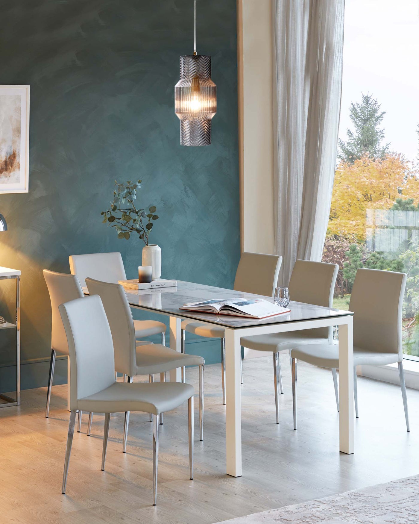 - How can I style my large dining table and chairs to create an inviting dining space?A large dining table offers a fantastic opportunity to create an inviting and stylish dining space. Start by choosing a centrepiece, such as a striking vase with fresh flowers or an arrangement of candles, to anchor the table and add visual interest. Placemats and napkins in complementary colours and textures can enhance the table setting while protecting the surface. Consider a table runner for added elegance or a casual feel, depending on your style. For lighting, a pendant light hung above the table creates a warm and intimate atmosphere. Don't forget the finishing touches: decorative bowls, sculptures, or even a stack of books can add personality and warmth to the space. To encourage conversation and create a welcoming ambience, ensure comfortable seating with enough space for everyone to move around freely. Finally, add a rug beneath the table to define the dining area and enhance the overall aesthetic, carefully selecting the material for easy cleaning and durability.