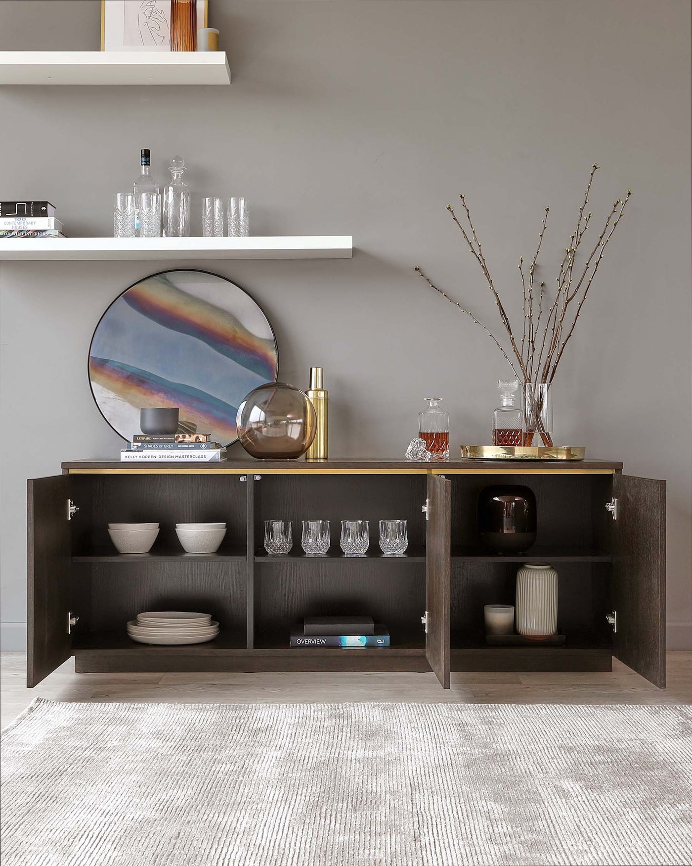 - How can I style my storage sideboard to enhance my living space?Styling a sideboard can transform your living space. Create a focal point by arranging decorative items like vases, sculptures, or books in varying heights and textures. A large statement piece can anchor the display, while smaller objects add visual interest. Incorporate greenery with plants or fresh flowers for a touch of life. Trays or decorative bowls can corral smaller items and add a touch of sophistication. For a balanced look, consider symmetry or asymmetry, depending on your style. If your sideboard has open shelves, use baskets or boxes to store items while keeping the look organised. Don't overcrowd the surface; leave some breathing room to avoid a cluttered feel. Finally, coordinate the colours and materials of your accessories with the sideboard and the surrounding decor for a cohesive look. A well-styled sideboard not only adds personality to your space but also provides practical storage. For more information visit our blog post.