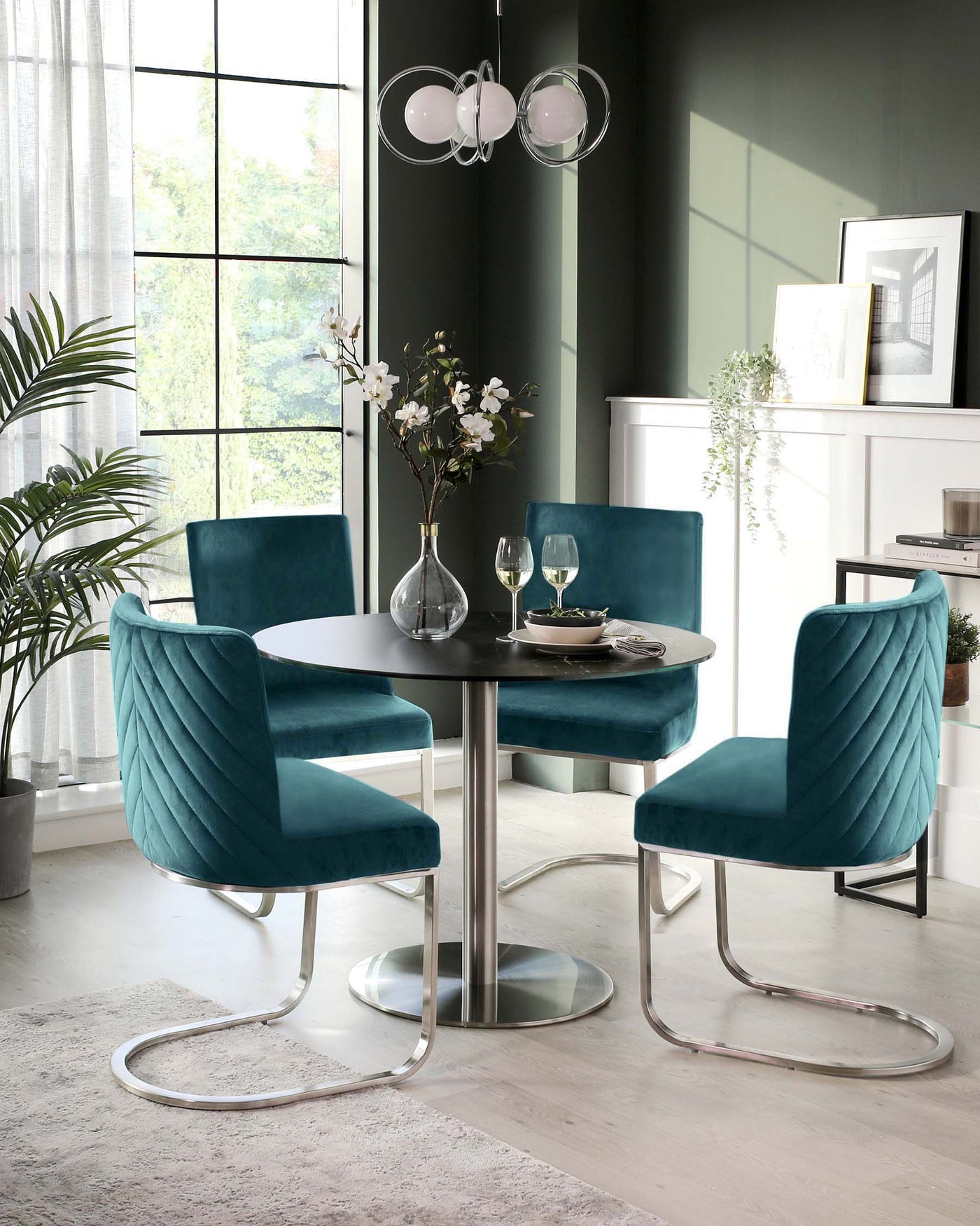 - How can I style my teal dining chairs?Teal dining chairs offer a rich colour that can be styled in various ways. For a sophisticated look, pair them with a dark wood dining table and metallic accents like gold or brass pendant lighting. A neutral rug in cream or grey can soften the look and create a sense of warmth. To enhance the teal, incorporate complementary colours such as blush pink or mustard yellow through cushions, artwork, or a centrepiece. For a bolder approach, set them against a contrasting wall colour like deep navy or emerald green. Consider adding patterned or textured cushions for extra comfort and visual interest. If your chairs are velvet, maintain their luxurious feel with regular brushing. For other upholstery types, follow the specific care instructions to keep them looking their best.