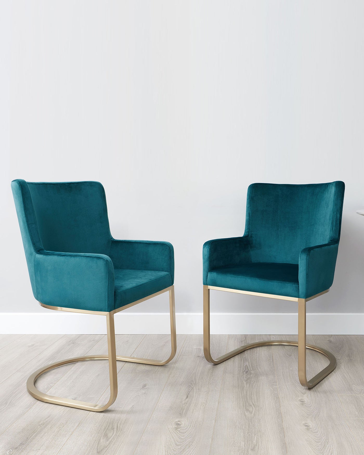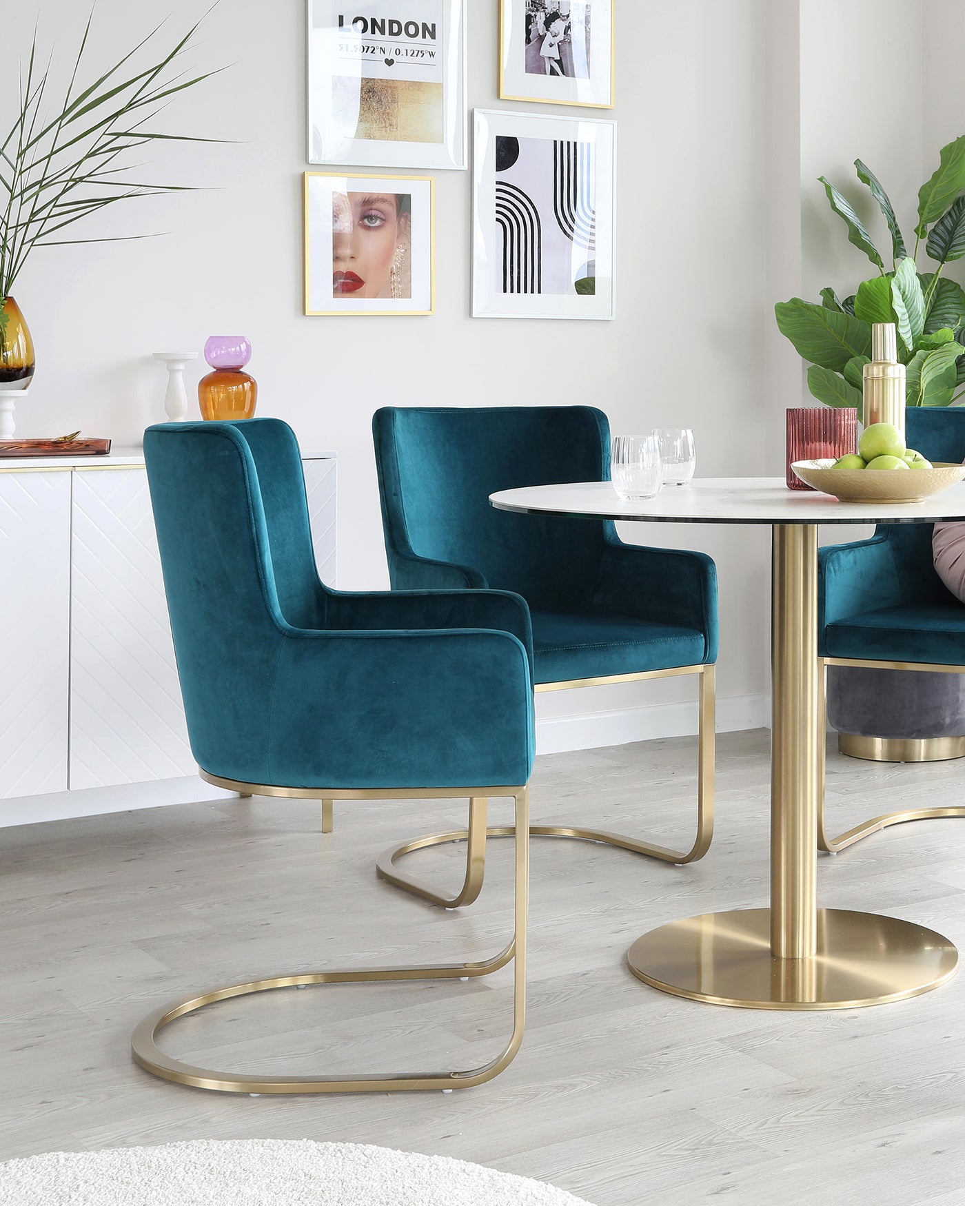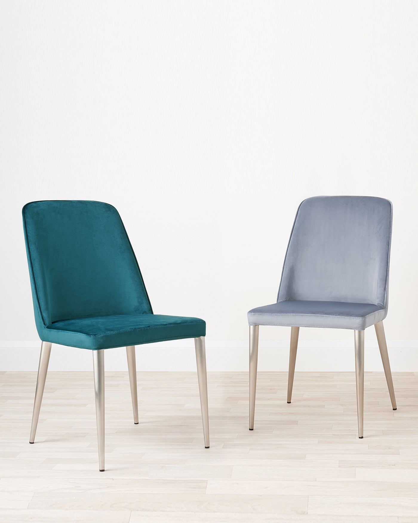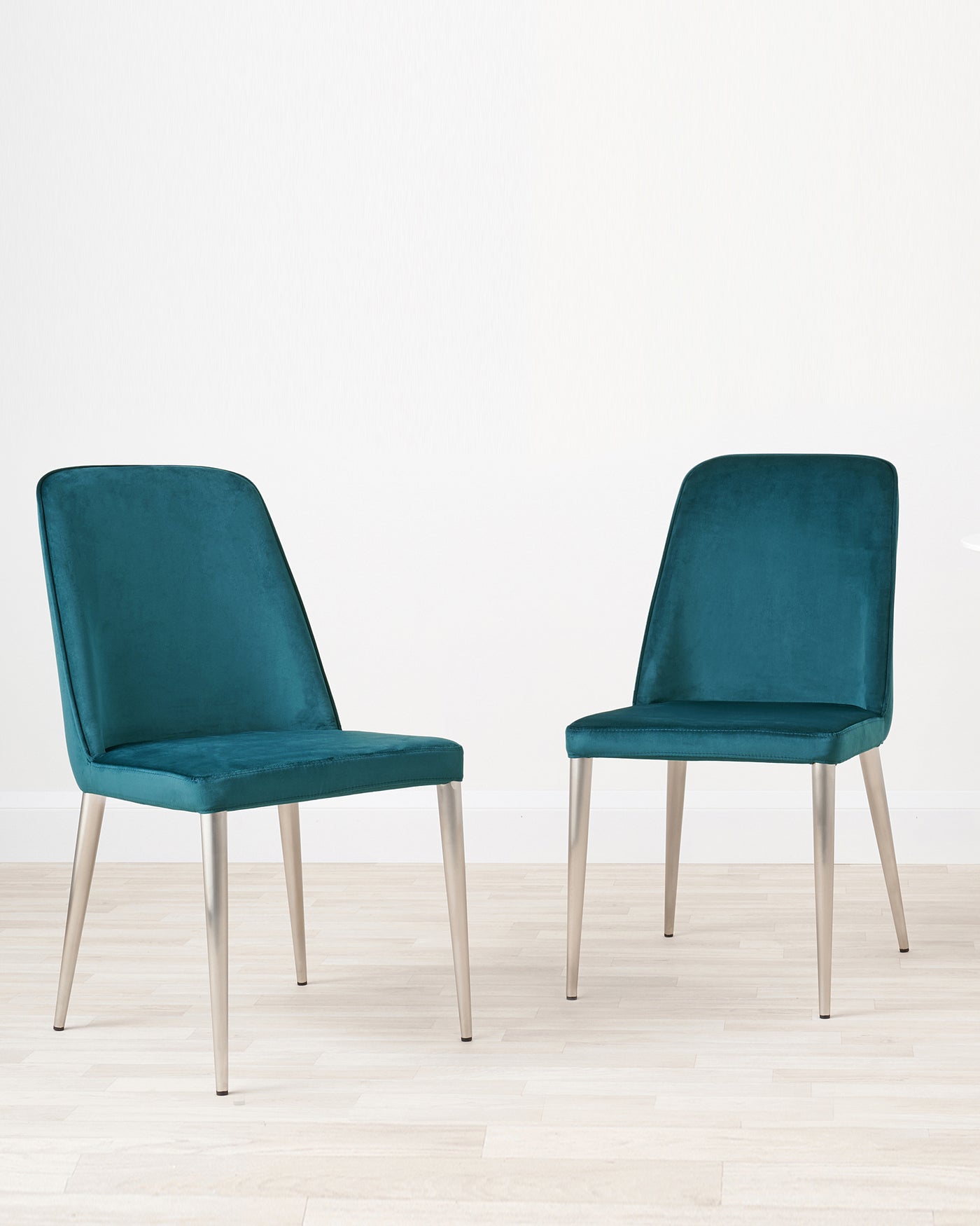 - What are the different styles of velvet dining chairs available?Our velvet dining chairs come in a variety of styles, from classic to contemporary. You'll find options with sleek, minimalist lines for a modern look, and others with more traditional or ornate frames. We offer various colours, from neutral champagnes and mochas to bolder greens and blues. Some chairs have metal legs and bases in finishes like brushed brass or stainless steel, while others have wooden legs. We also stock velvet dining chairs with and without arms, as well as swivel options. Many of our velvet dining chairs are sold as sets of two.