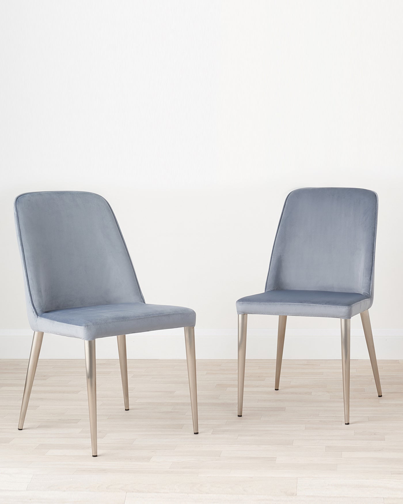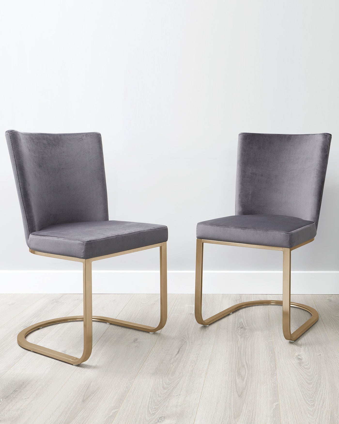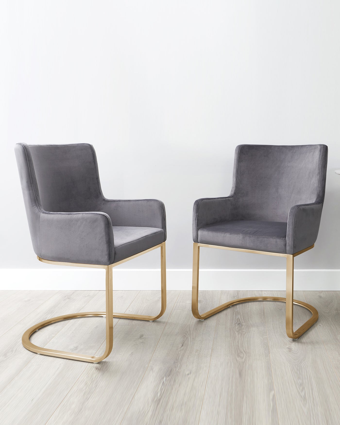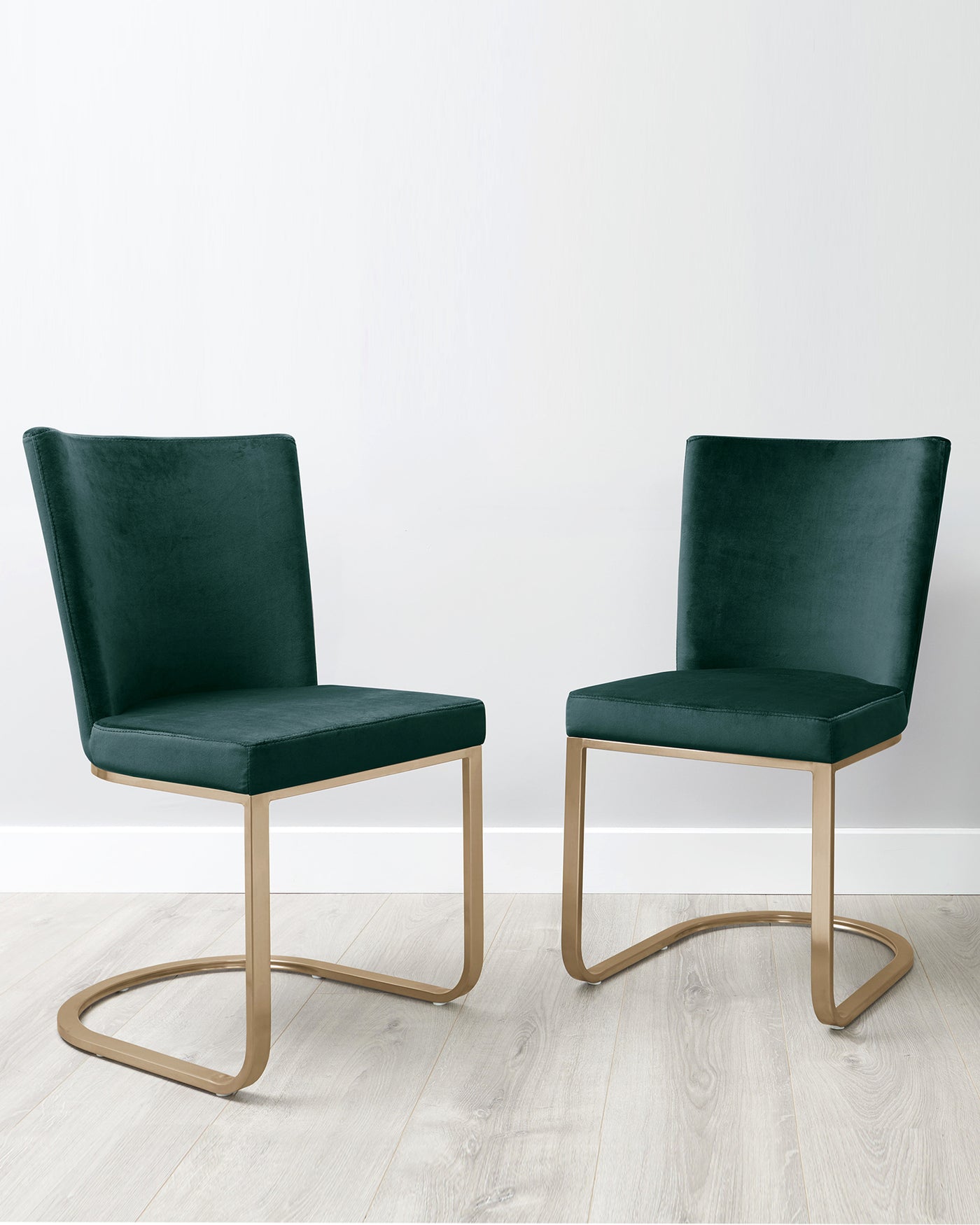 - What are the different styles of velvet dining chairs available?Our velvet dining chairs come in a variety of styles, from classic to contemporary. You'll find options with sleek, minimalist lines for a modern look, and others with more traditional or ornate frames. We offer various colours, from neutral champagnes and mochas to bolder greens and blues. Some chairs have metal legs and bases in finishes like brushed brass or stainless steel, while others have wooden legs. We also stock velvet dining chairs with and without arms, as well as swivel options. Many of our velvet dining chairs are sold as sets of two.
