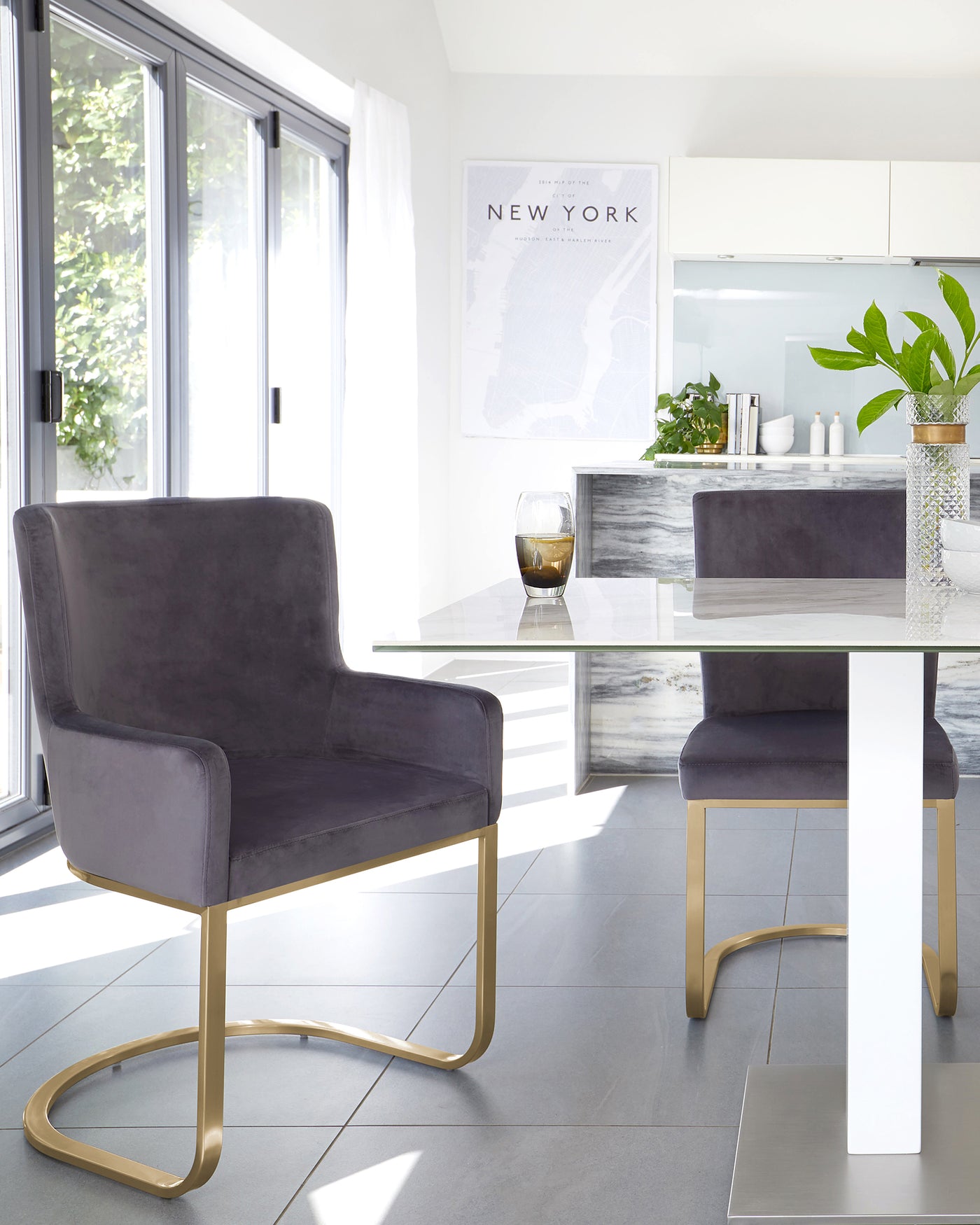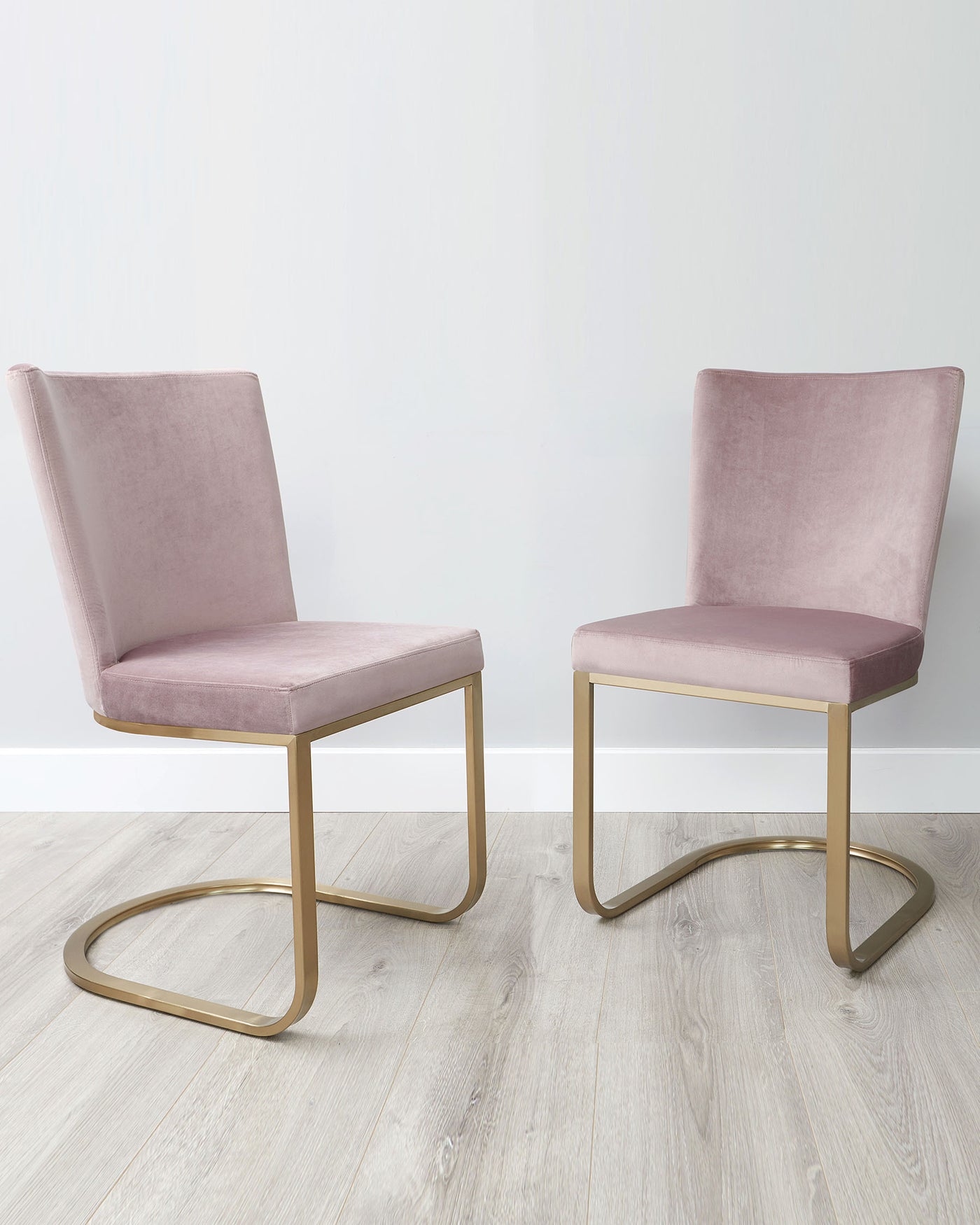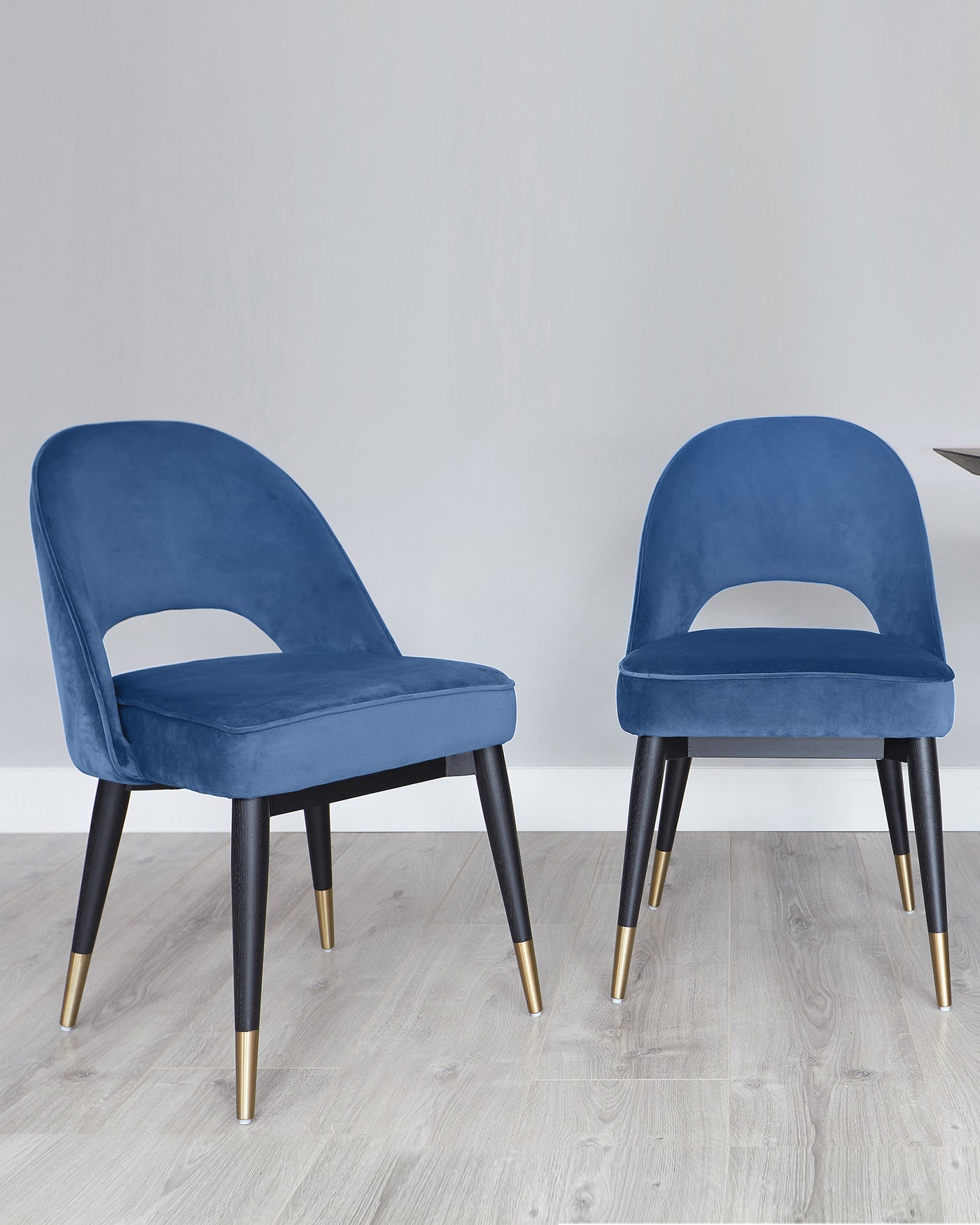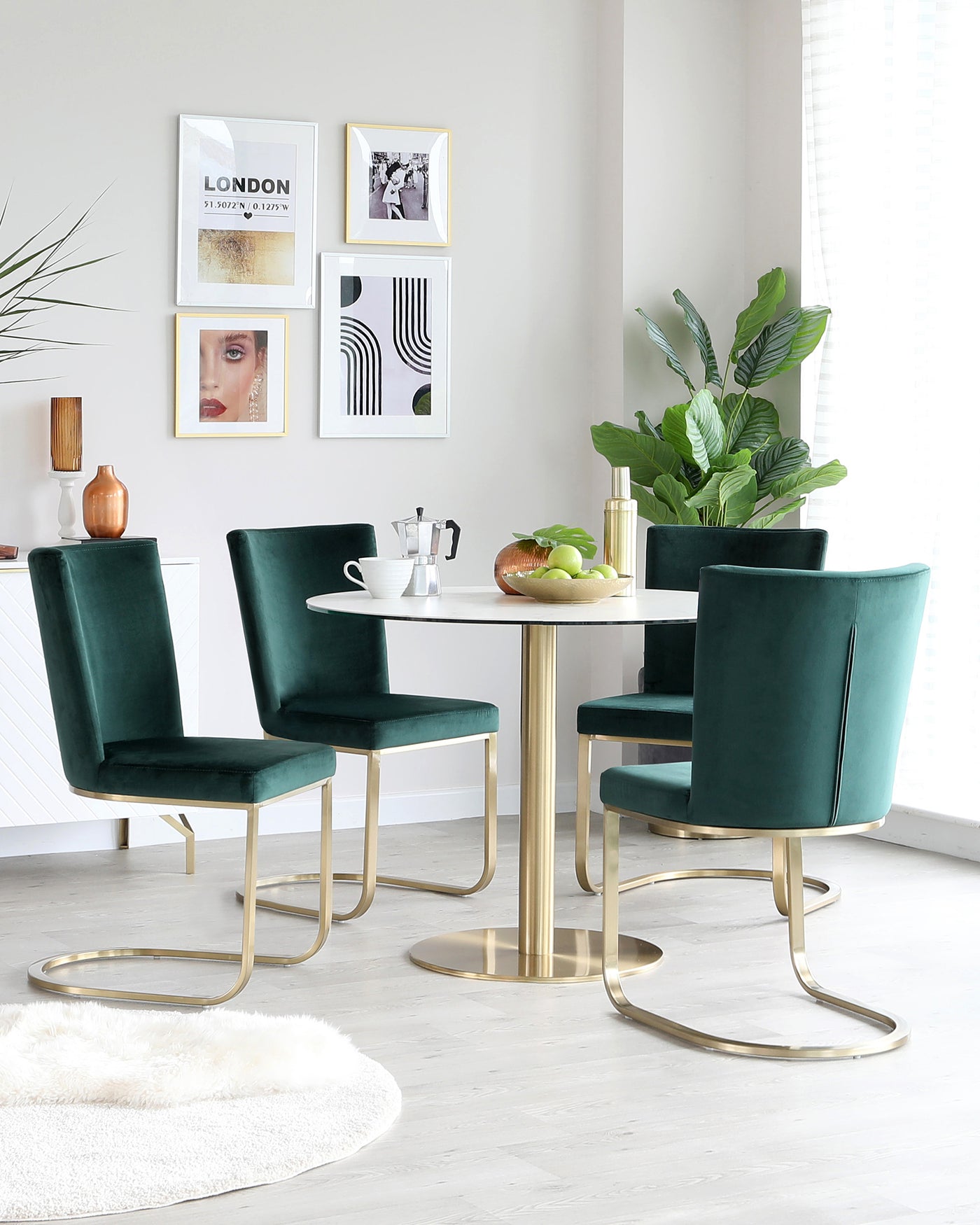 - What are the different styles of velvet dining chairs available?Our velvet dining chairs come in a variety of styles, from classic to contemporary. You'll find options with sleek, minimalist lines for a modern look, and others with more traditional or ornate frames. We offer various colours, from neutral champagnes and mochas to bolder greens and blues. Some chairs have metal legs and bases in finishes like brushed brass or stainless steel, while others have wooden legs. We also stock velvet dining chairs with and without arms, as well as swivel options. Many of our velvet dining chairs are sold as sets of two.