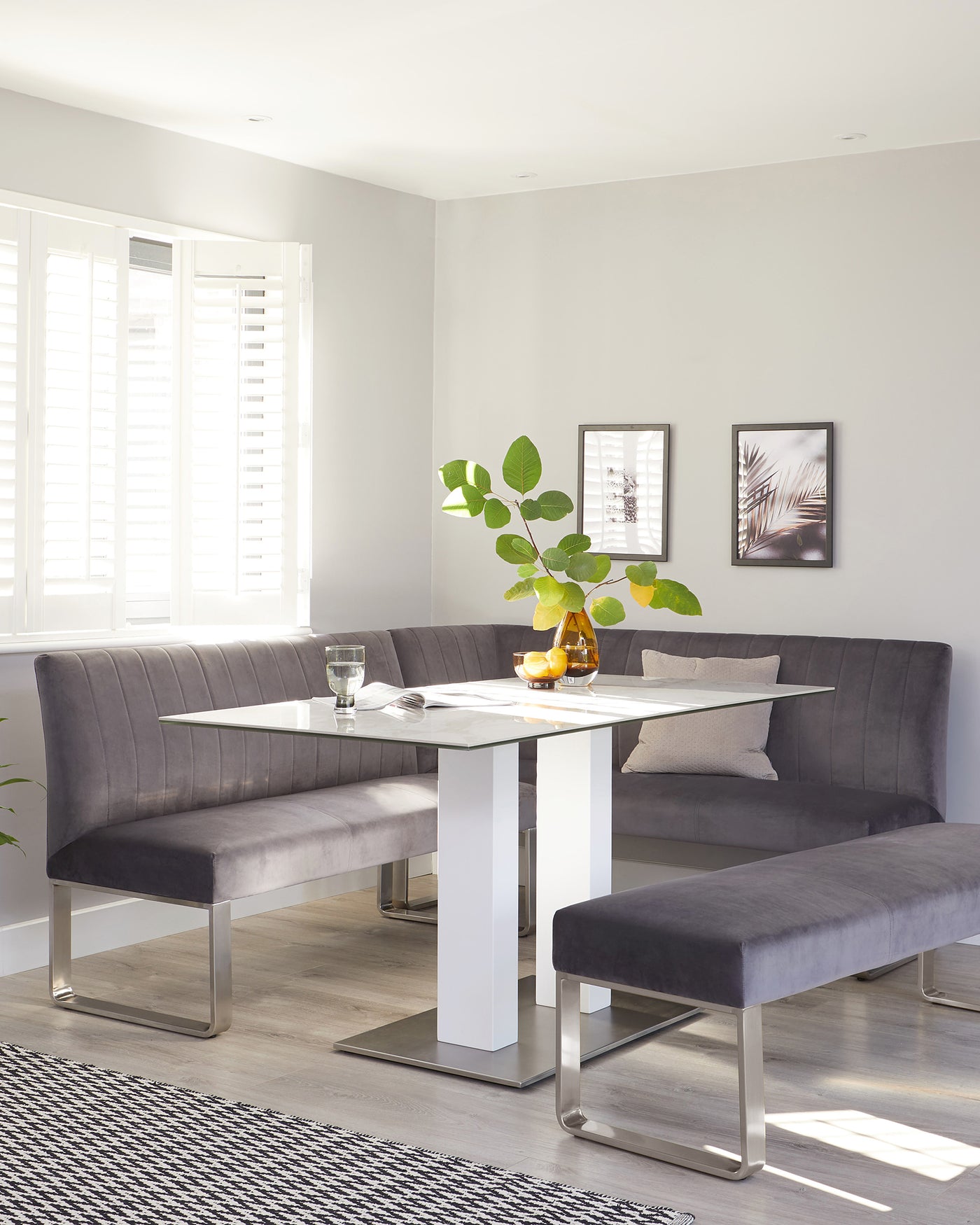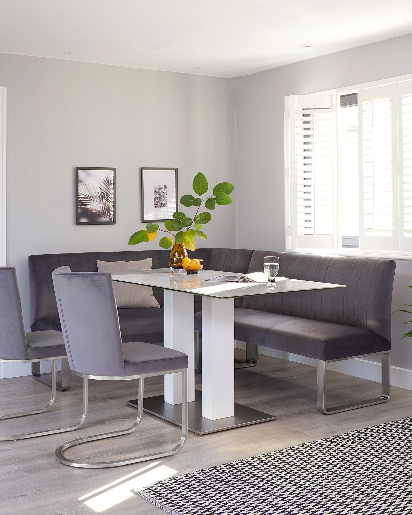 The range offers a variety of seating capacities, with options for three-seaters and expansive five-seater corner benches. These benches are designed for practicality and durability, with features such as foam cushioning for enduring comfort and floor protectors to keep your surfaces scratch-free.