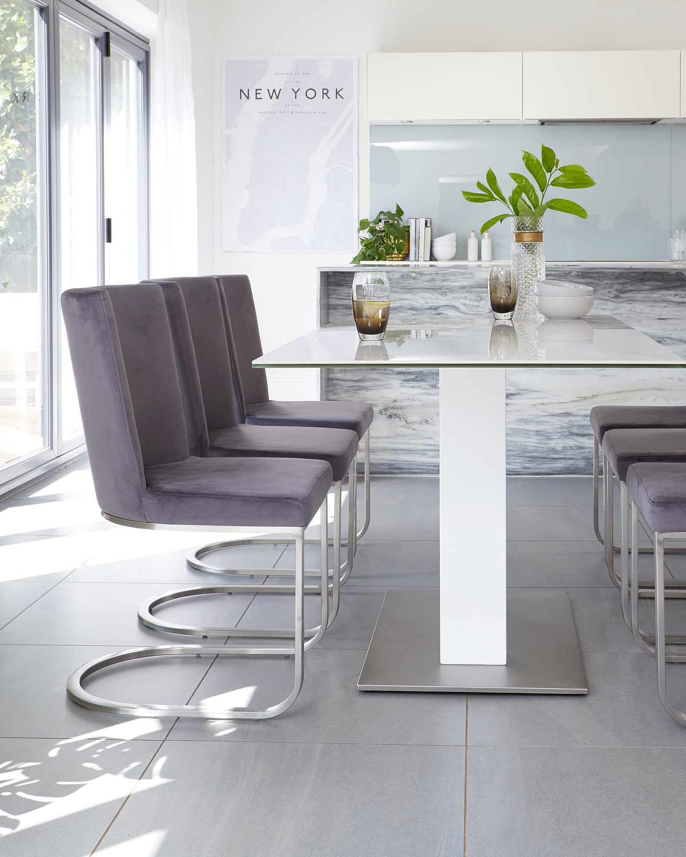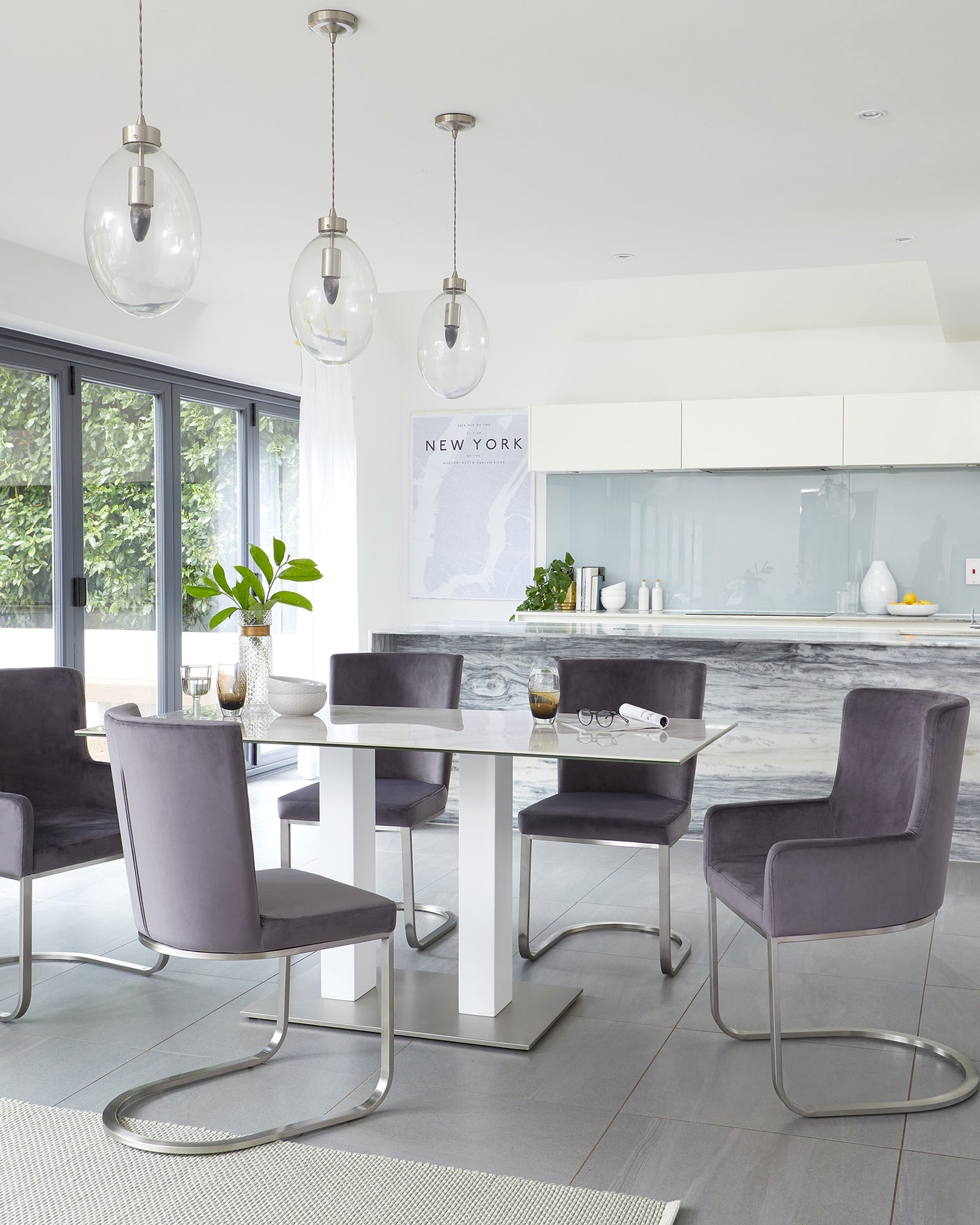 These sets are available in a variety of sizes, from cosy two-seaters to spacious six or eight-seaters with handy extension leaves. Matching chairs are upholstered in materials such as faux leather or plush velvet, in a spectrum of colours from soft greys to vibrant teal.