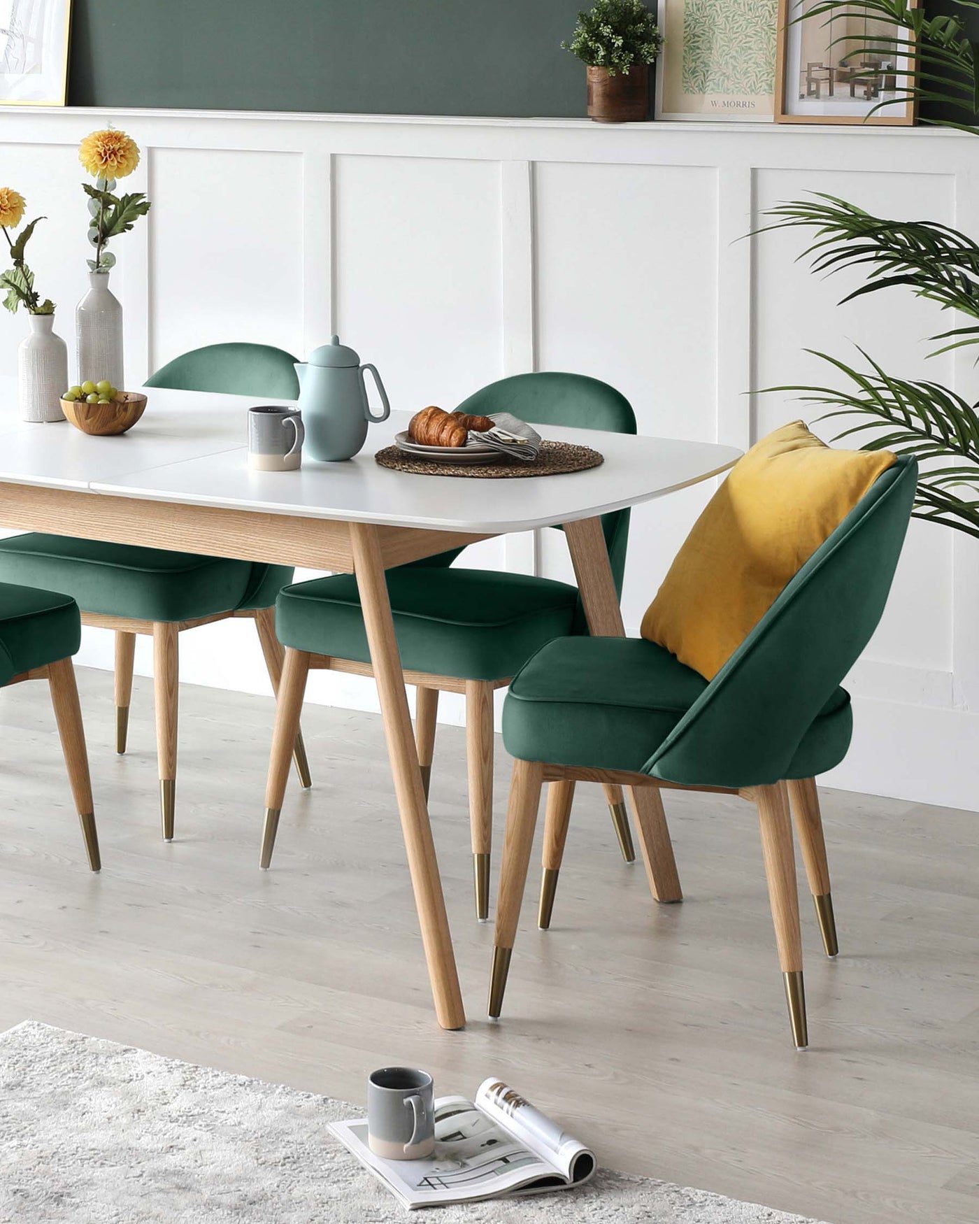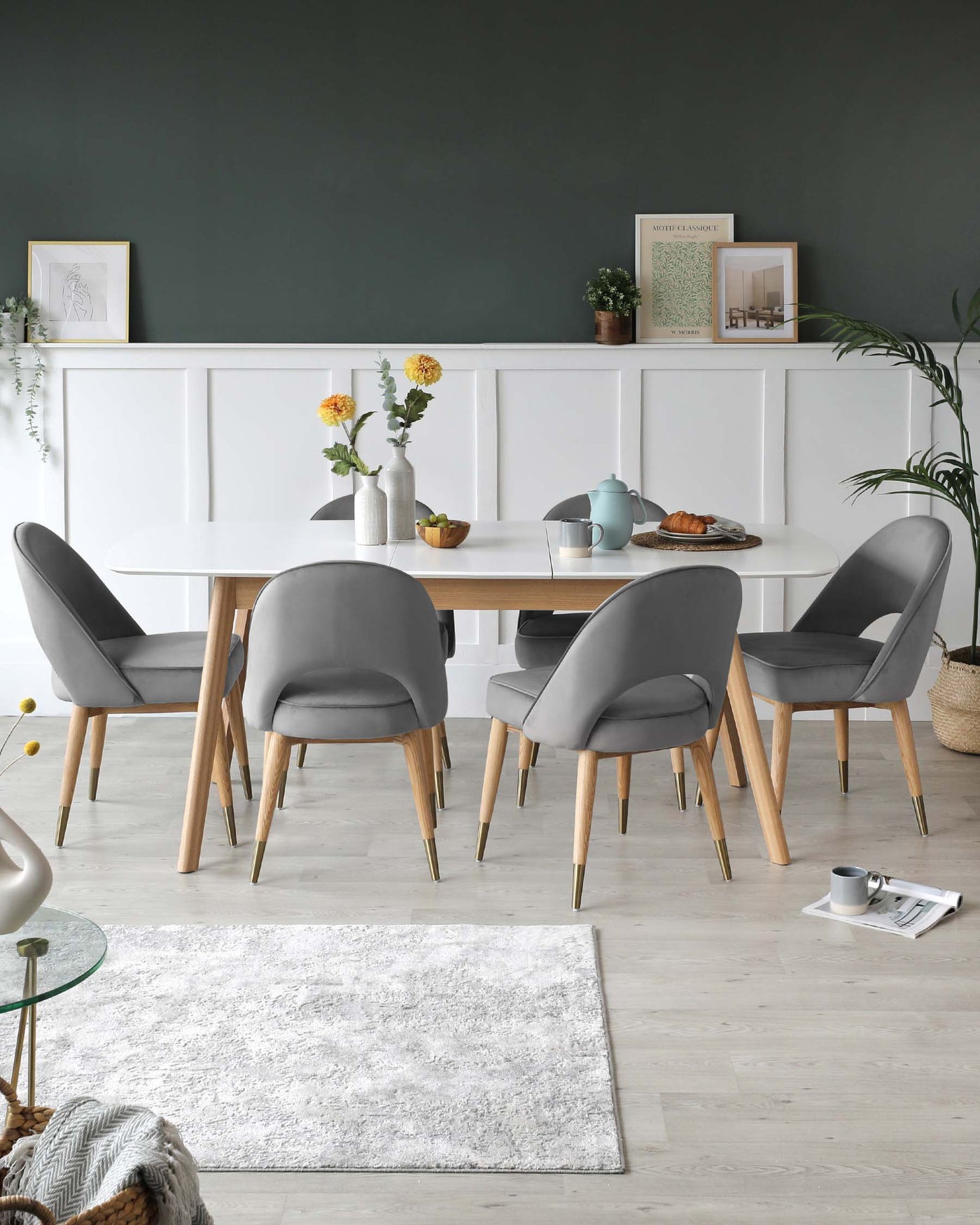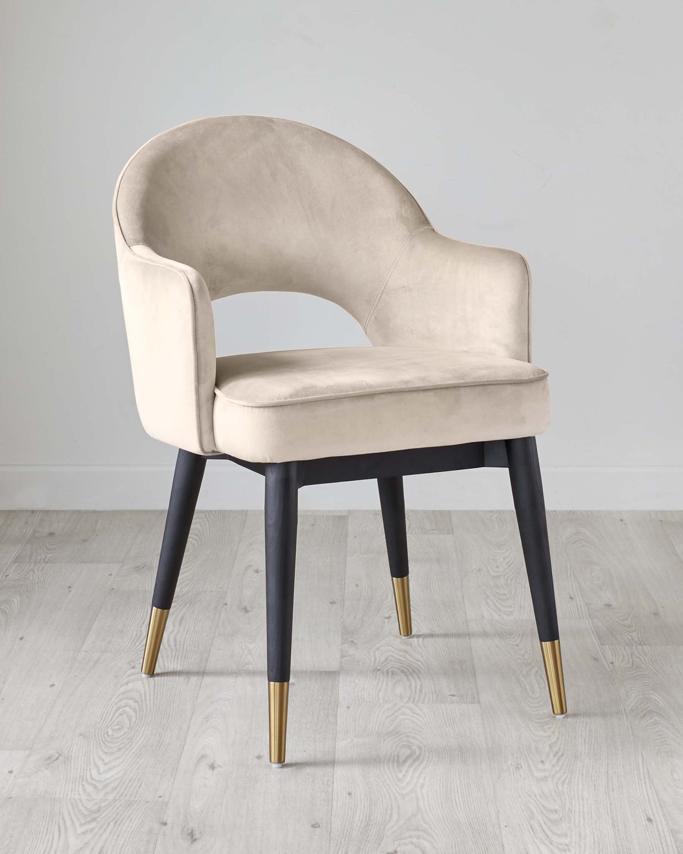 The influence of mid-century styles can be seen in the curved backs, cut-out details, and brushed metal caps on legs. A spectrum of colours, from blue-grey to dark teal and champagne, allows for seamless integration into your existing decor.