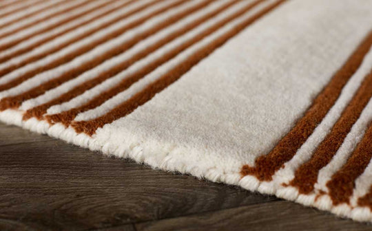 The Abstract Lines large rug brings contemporary sophistication to your space with its striking concentric curves in warm rust and cream. Hand-woven from luxuriously soft wool, this statement piece features a high/low pile construction that creates captivating depth and texture. Perfect for anchoring your living room or adding warmth to your bedroom, its generous 290cm x 200cm size makes it ideal for defining conversation areas or grounding your furniture arrangement.