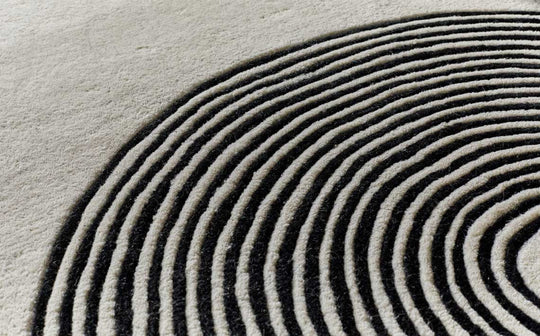The Abstract Lines black and cream wool medium rug makes a statement with its bold graphic pattern of concentric circles and stripes. Handwoven from 100% wool with a sculpted high/low pile, this tactile piece creates visual depth and texture underfoot. Perfect for modern living rooms, its monochrome palette works beautifully with neutral furnishings while the abstract design adds artistic flair to your space.