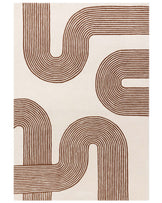 The Abstract Lines rust and cream wool small rug brings warmth and artistic flair to your floors. Hand-woven from 100% wool, this striking piece features concentric curves that create visual interest in any room. The high/low pile adds textural depth, making it perfect for grounding a seating area or adding comfort beside your bed.