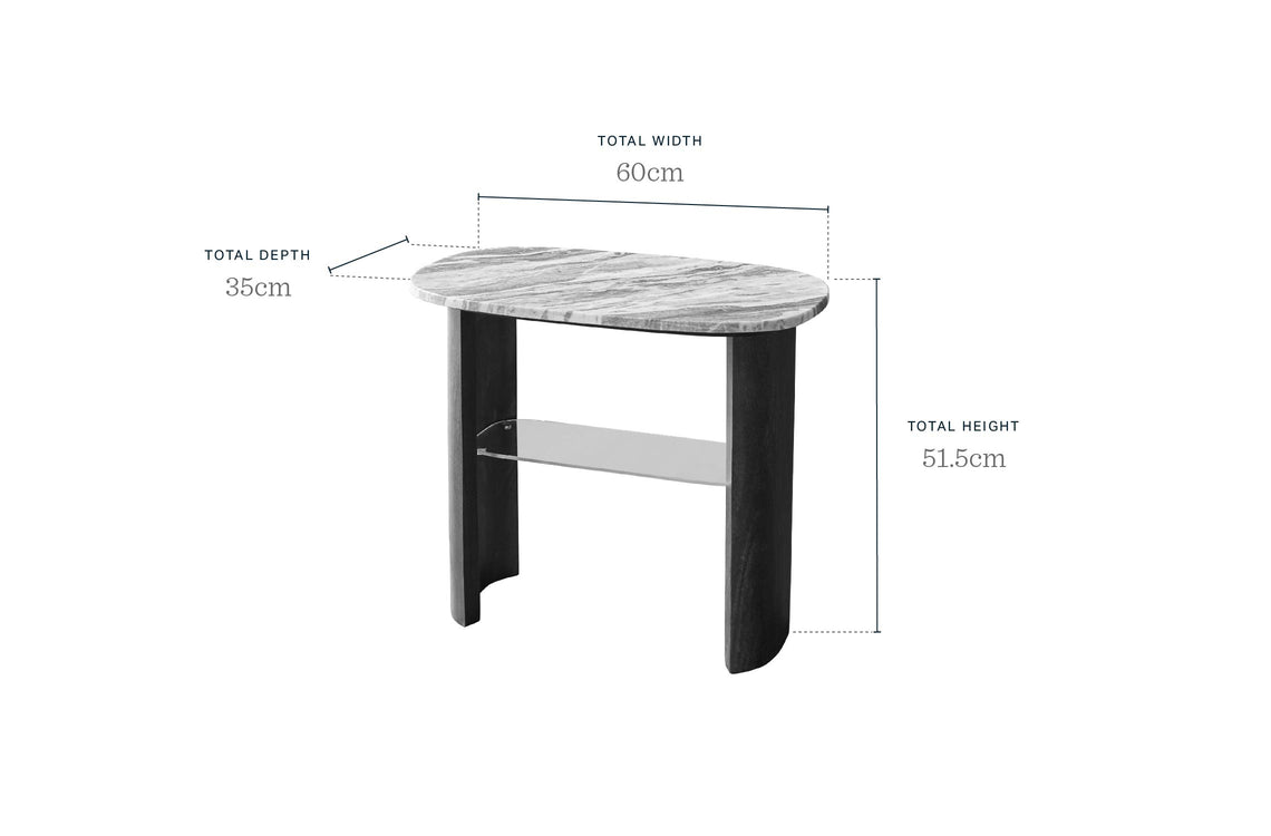 The Adalynn marble side table combines natural luxury with practical design. Its genuine marble oval top brings organic beauty to any room, while the rich dark mango wood base adds warmth and stability. A tempered glass shelf tucked beneath provides storage for magazines, remotes or decorative pieces - perfect beside your sofa or as a stylish bedside companion.