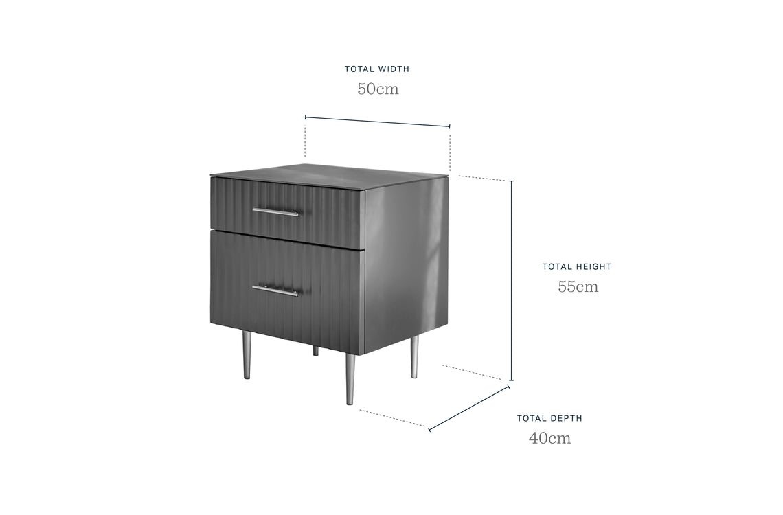 Grey bedside table with two drawers. Dimensions: 50cm wide, 40cm deep, 55cm high.