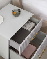 Modern white bedside table with an open drawer revealing organized compartments, some filled with neatly folded fabrics. The drawer features unique wave-textured fronts and elegant golden handles. A simple, sleek design with a glossy finish, showcased next to a soft-toned bed. A clear glass bowl with a slice of orange and a white round plate are placed on top of the table, adding a pop of colour and a decorative touch.