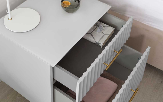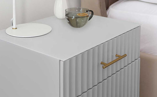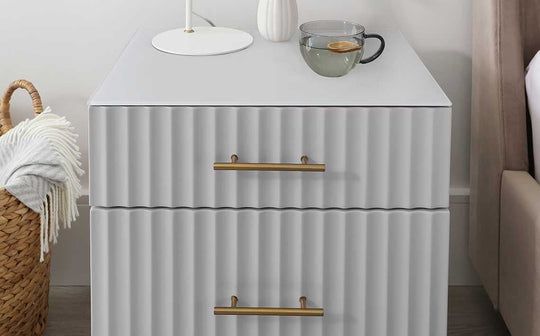 The Albury light grey 2 drawer bedside table brings refined storage to your bedroom with its distinctive fluted design and brass-accented legs. Two soft-close drawers lined with luxurious velvet keep bedside essentials organised, while the frosted glass top adds contemporary sophistication. Perfect beside your bed or as an accent piece in any room needing stylish storage.