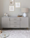 The Albury light grey sideboard brings sophisticated storage to any room with its considered blend of frosted glass doors, velvet-lined drawers and brass accents. This versatile piece offers generous space across two cupboards and three drawers, keeping everything from dinnerware to documents beautifully organised while maintaining a refined presence in your living or dining space.