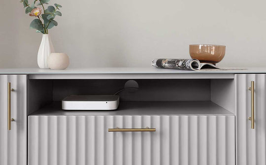 The Albury light grey TV unit brings sophisticated storage to your living space with its contemporary fluted detailing and warm brass accents. Two cupboards flank a central open section perfect for media devices, while a velvet-lined drawer below offers hidden storage. The soft-close runners ensure quiet operation, and integrated cable management keeps everything tidy.