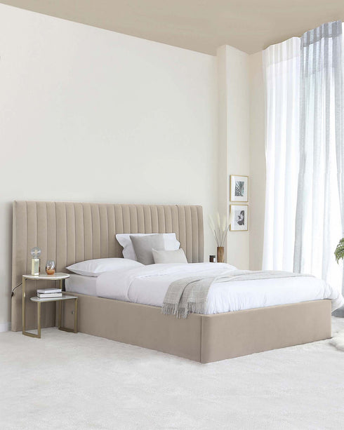 Transform your bedroom into a luxurious retreat with the Amalfi Luxe champagne velvet king size ottoman storage bed. Its dramatically tall, vertically ribbed headboard creates an instant focal point, while the sumptuous champagne velvet upholstery brings warmth and sophistication to your space. Beneath its elegant exterior lies practical ottoman storage, perfect for bedding and seasonal items, accessible via smooth hydraulic pistons.