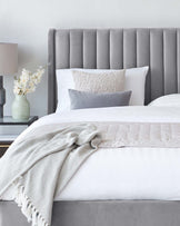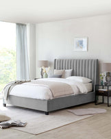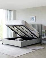 Create your perfect bedroom retreat with the Amalfi ottoman bed, where sophisticated design meets clever storage. Upholstered in smooth matt grey velvet with a striking vertically ribbed headboard, this double bed brings contemporary elegance to your space. The hidden ottoman storage beneath offers generous room for bedding and essentials, keeping your sanctuary beautifully uncluttered.