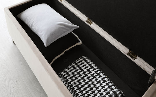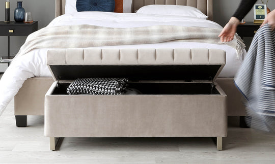 The Amalfi champagne velvet ottoman storage bench brings sophisticated comfort to your space while cleverly concealing clutter. This generously sized bench features luxurious champagne velvet upholstery with elegant ribbed detailing across its cushioned top. Perfect for the end of your bed, hallway or living room, it offers both a comfortable perch and spacious hidden storage for blankets, bedding and everyday essentials.
