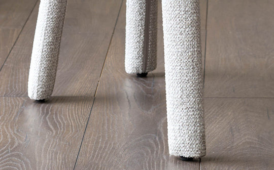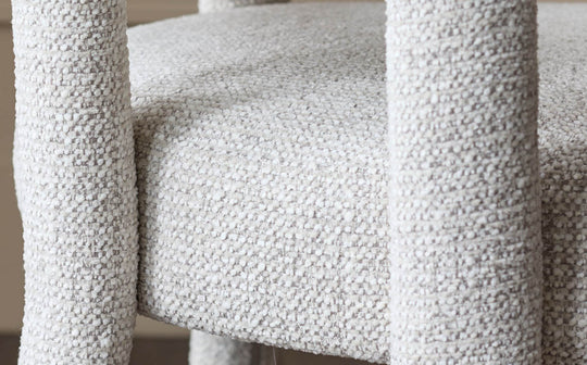 The Anya natural fabric dining chair brings sculptural style and serious comfort to your dining space. Upholstered in soft, chunky chenille fabric with a distinctive rounded seat and gently sloped backrest, this statement chair works beautifully around the dining table or as an accent piece in bedrooms and living spaces. Four fully upholstered legs create a cocoon of comfort while solid wood supports underneath add structural integrity.