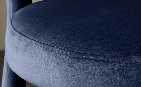 The Anya dark navy velvet dining chair brings sophisticated comfort to your dining space. Upholstered in rich recycled velvet, this generously proportioned chair features a rounded seat and gently sloped backrest that creates a luxurious hug-feel. Perfect for long dinner parties or as a statement accent chair in your bedroom.