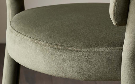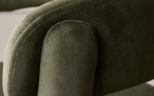 The Anya olive green velvet dining chair brings sophisticated comfort to your dining space. Upholstered in rich, recycled velvet, this generously proportioned chair features a rounded seat and gently sloped backrest that make long dinners a pleasure. Its fully upholstered legs create a cohesive, contemporary look while the solid wood core ensures lasting durability.