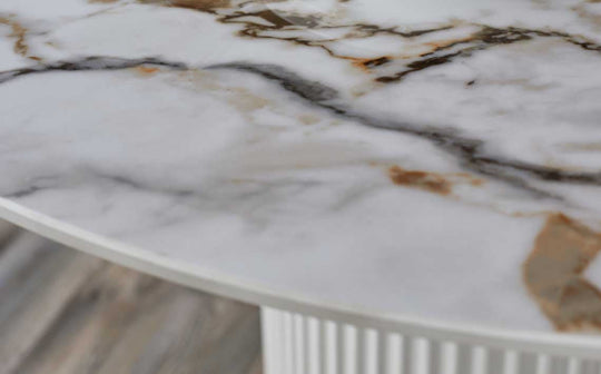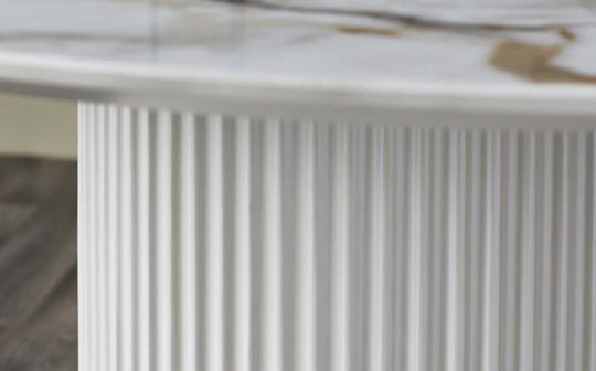 The Austin natural ceramic 6 seater dining table brings sophisticated style to every gathering. Its striking textured pedestal base supports a glossy ceramic top that's as practical as it is beautiful - resistant to scratches and heat, ready for everything from morning coffee to dinner parties. The round design seats 6 comfortably, creating an intimate dining experience where conversation flows naturally.