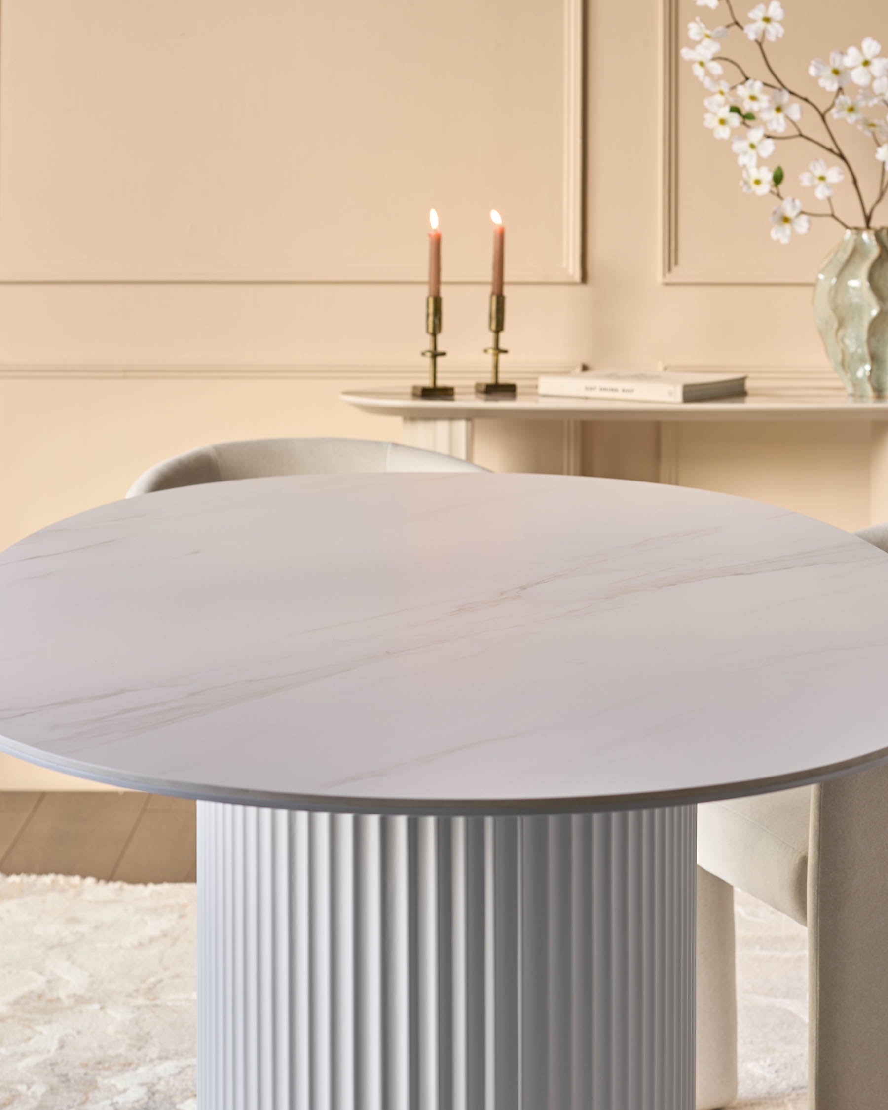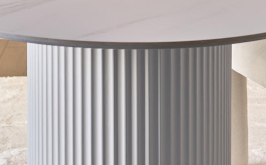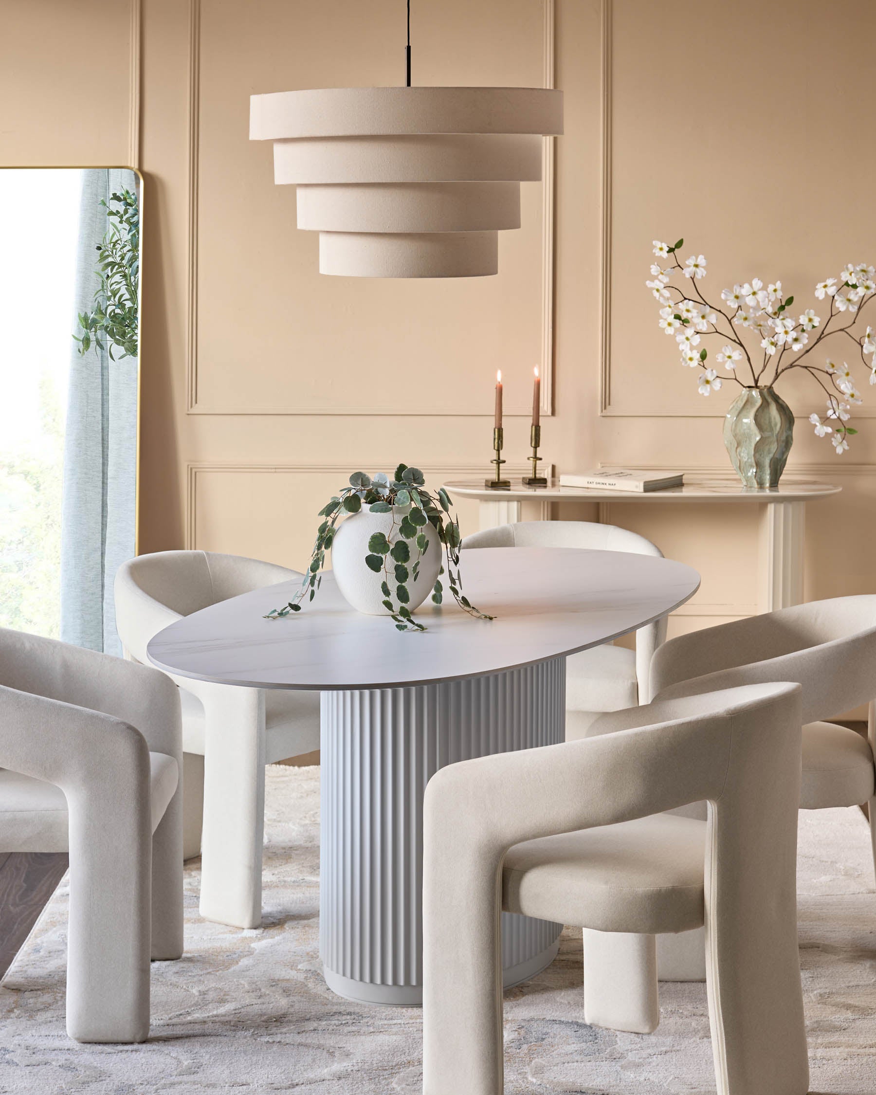 The Austin white marbled ceramic fluted 6 seater dining table combines sculptural beauty with practical durability. Its striking fluted pedestal base creates visual interest while maximising legroom for comfortable dining. The oval ceramic top, with its elegant white marble effect, resists scratches and heat, making it perfect for everything from weeknight dinners to weekend entertaining.