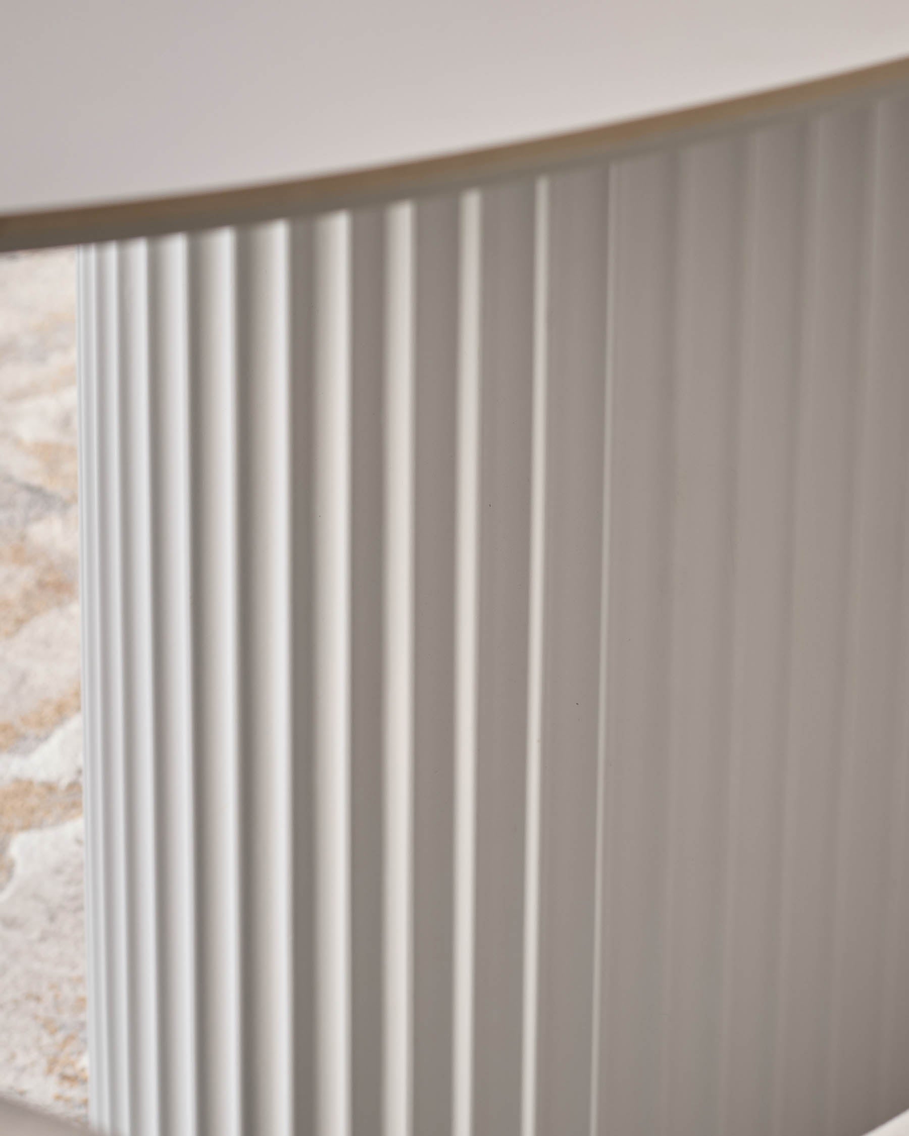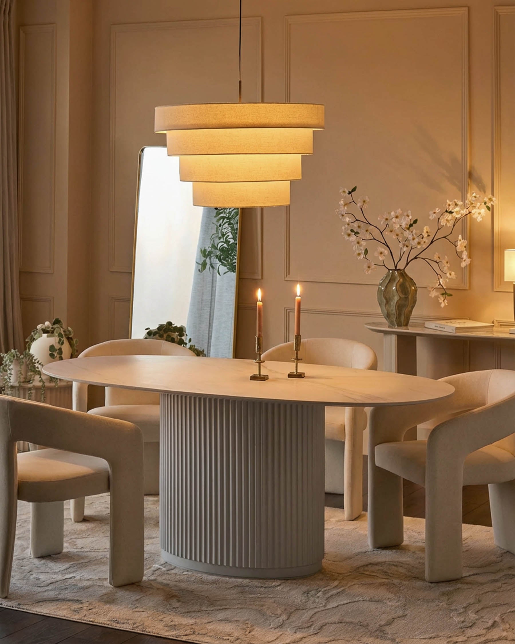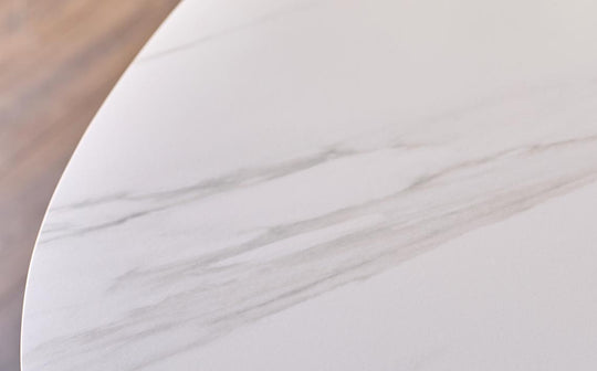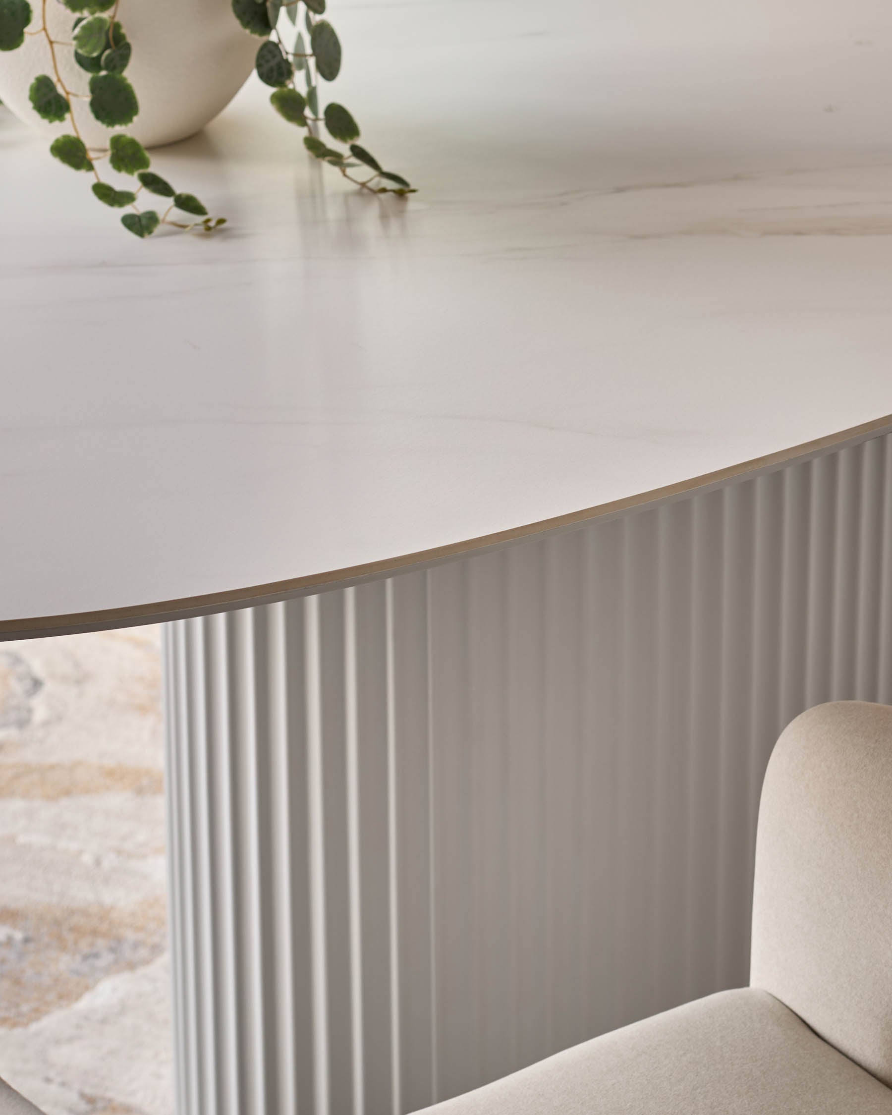 The Austin white marbled ceramic fluted 6 seater dining table combines sculptural beauty with practical durability. Its striking fluted pedestal base creates visual interest while maximising legroom for comfortable dining. The oval ceramic top, with its elegant white marble effect, resists scratches and heat, making it perfect for everything from weeknight dinners to weekend entertaining.