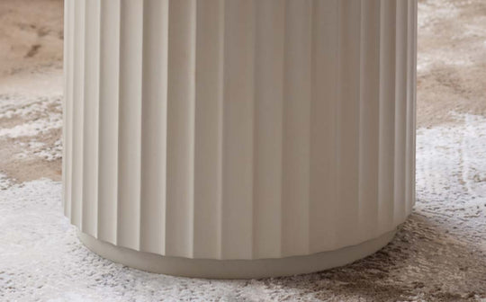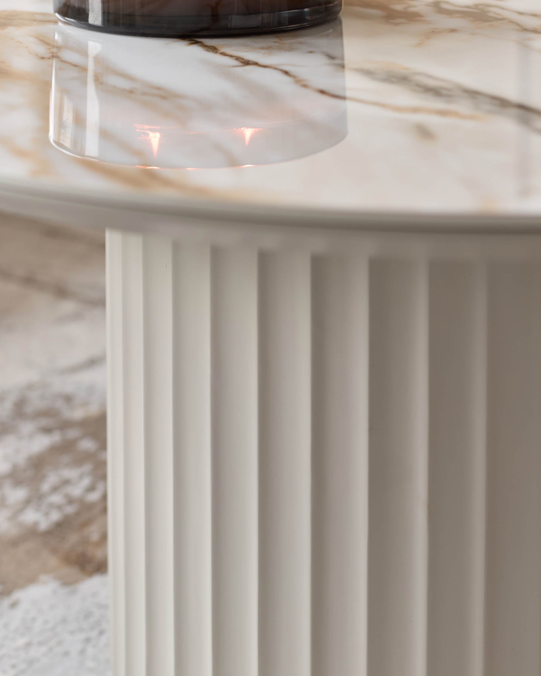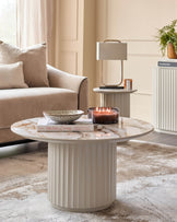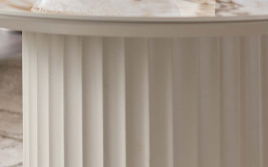 The Austin natural ceramic coffee table brings sophisticated style to your living space with its striking round silhouette and luxurious stone-effect finish. The high-gloss ceramic top catches and reflects light beautifully, while the fluted pedestal base adds architectural interest. Heat and stain-resistant, it's built for real life - from morning coffees to evening gatherings.